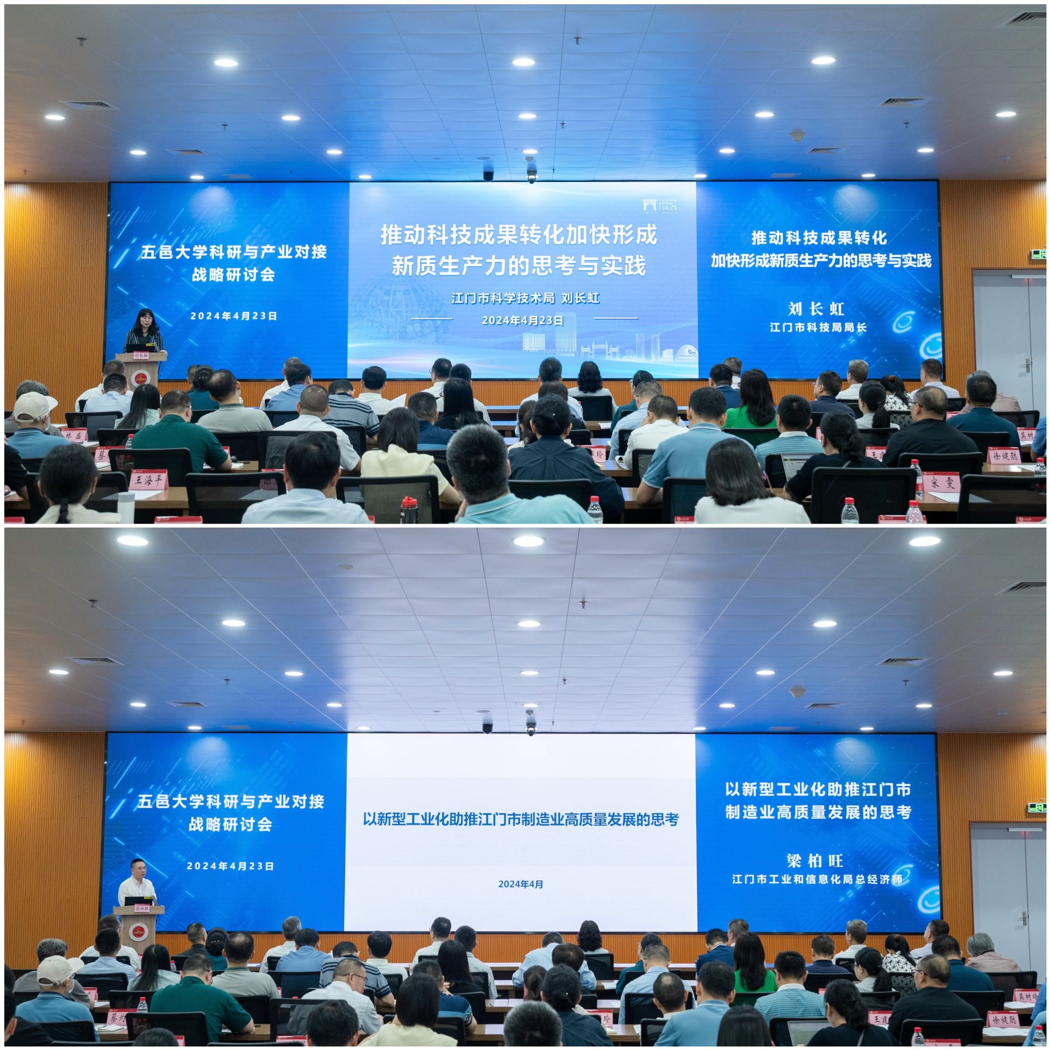 為全面貫徹落實全國兩會精神和廣東省高質(zhì)量發(fā)展大會精神,落實學校黨委常委會會議傳達學習貫徹江門市推進新型工業(yè)化建設(shè)制造強市暨企業(yè)高質(zhì)量發(fā)展大會精神,提高學校自主科研創(chuàng)新能力,以科技創(chuàng)新引領(lǐng)促進現(xiàn)代化產(chǎn)業(yè)體系建設(shè),4月23日,五邑大學召開科研與產(chǎn)業(yè)對接戰(zhàn)略研討會。本次研討會匯聚了政產(chǎn)學研用多方力量,深入剖析了科研與產(chǎn)業(yè)對接的難點、堵點,共同探討科研與產(chǎn)業(yè)對接的新模式、新路徑,為進一步做好科技創(chuàng)新推動產(chǎn)業(yè)創(chuàng)新工作打下扎實工作基礎(chǔ)。