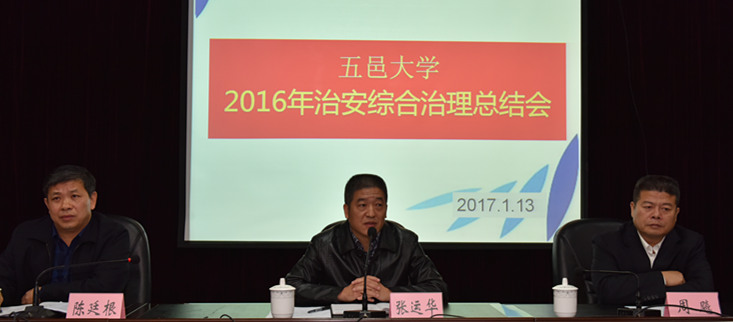 1月13日下午,我校在南主樓七樓大會議室召開了2016年治安綜合治理總結會議。校長張運華、副校長周飚、陳廷根以及學校全體治安綜合治理責任人出席了會議。會議由副校長周飚主持。