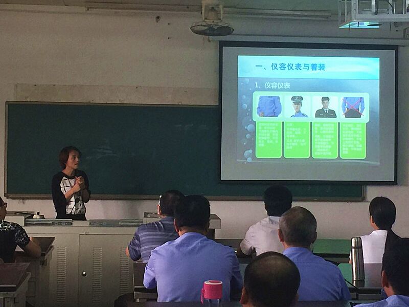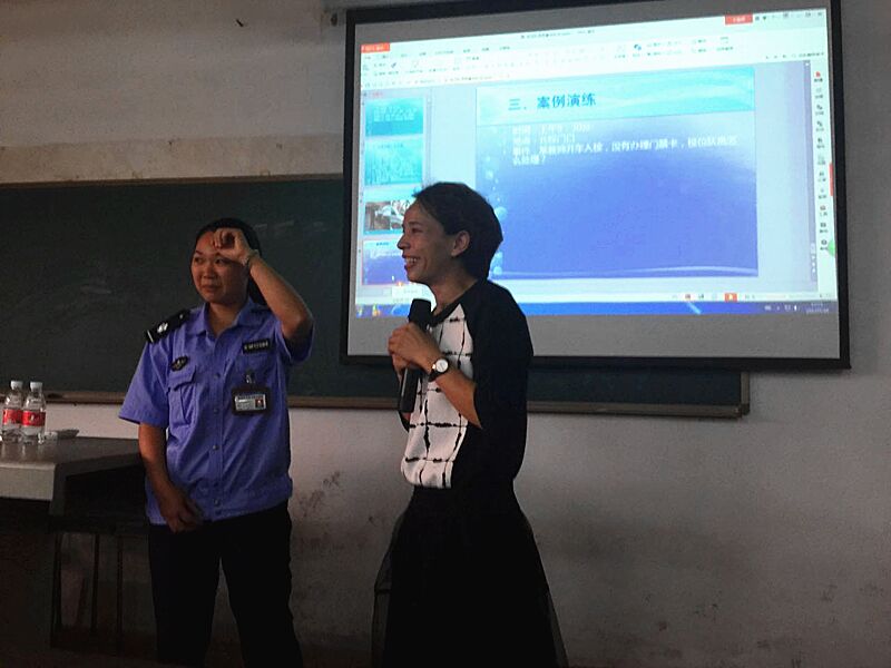 江汝南老師主要從兩個方面為隊員們進行了講解,包括儀容儀表與著裝,日常禮節與文明用語。她強調校衛隊員首先要注重儀容儀表,其次要注意站姿、敬禮、坐姿、蹲姿的規范問題。在禮節與禮貌方面,她著重強調了文明禮貌用語使用的重要性,并向校衛隊員們講解了《五邑大學門衛用語》。此次講座還特別加入了案例演練環節,邀請校衛隊員上臺參與,江老師為大家做了正確的示范。