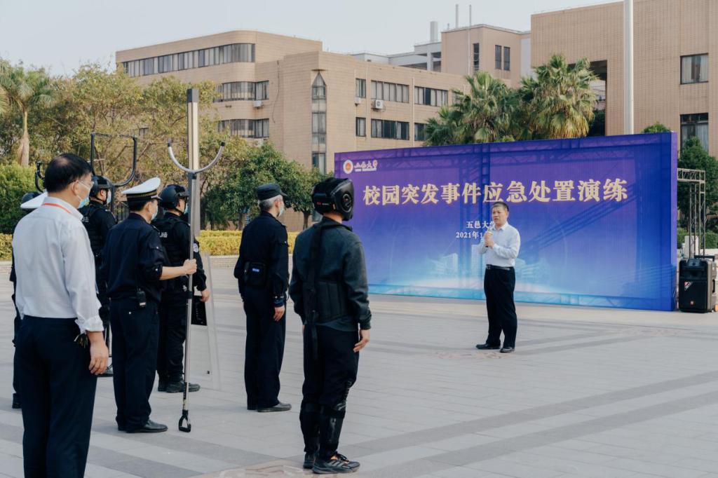 磨礪“安保利劍”守護師生安全。1月26日下午,安保處聯合蓬江區公安分局在菩提廣場開展校園突發事件應急處置演練。