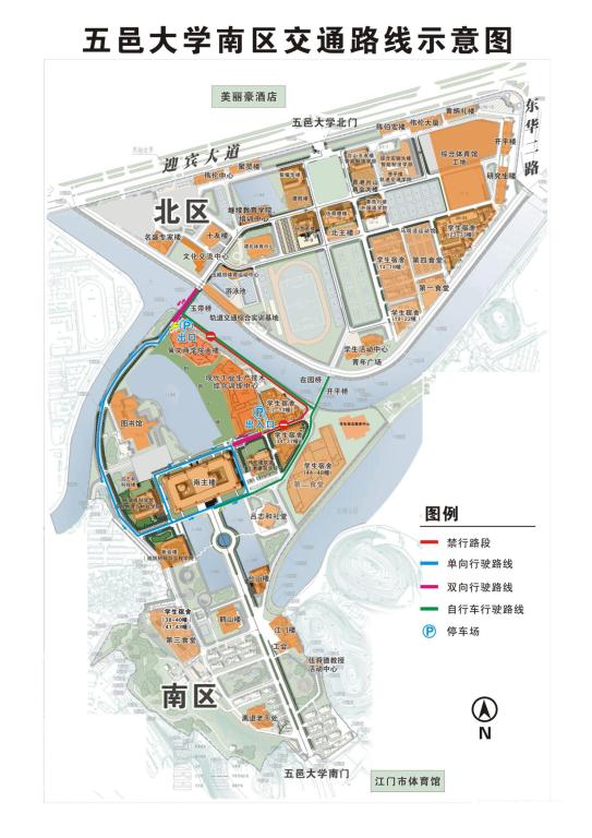 1.環校道路段機動車北區往南區單向通行、南區往北區禁止通行,行人南北通行,自行車禁止進入;