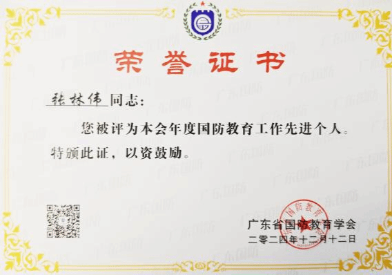 12月25日至29日,廣東省國防教育2024年度會議在中山市召開,會議對2024年度全省國防教育工作進行了總結,對年度工作成績突出的單位和個人進行了表彰獎勵。我校榮獲2024年度國防教育工作先進單位,曹榮軍、張林偉、張健、夏睦翔、王俊杰榮獲國防教育工作先進個人。
