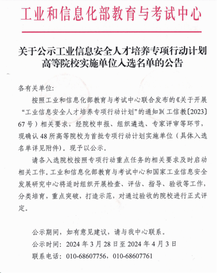- 喜訊!我校入選工業信息安全人才培養專項行動計劃高等院校實施單位 2024-04-05