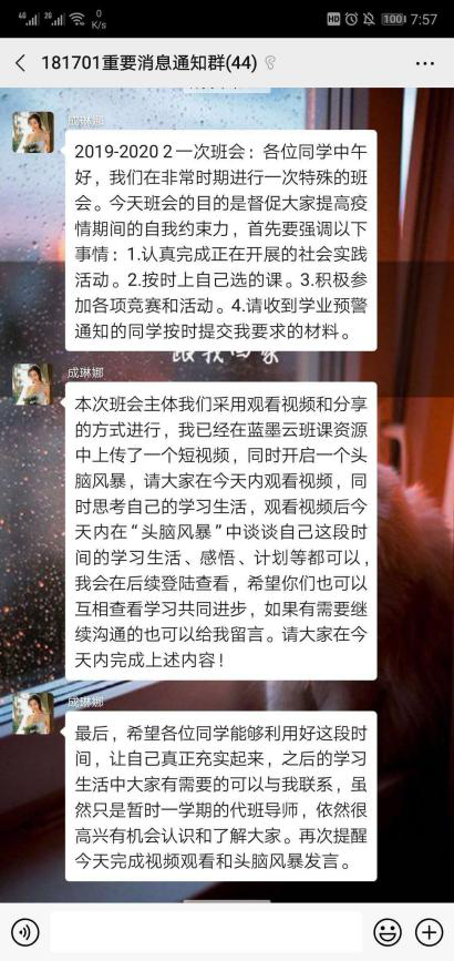 據悉,在完成學校統一要求的“規定動作”基礎上,各班還紛紛開展了形式多樣的個性化活動。2016級的班導師根據“網絡就業”和畢業論文展開指導;171704班同學在班導師帶領下完成了一次新穎的線上模擬面試;181703等班級邀請參加志愿服務的同學“線上”分享在疫情防控前沿擔任志愿者的經歷和體會;191701等班級舉辦了疫情防控知識競賽,既增強了班會趣味性,又普及了健康知識與防疫信息;181702班則邀請輔導員老師結合“全國大學生疫情防控思政課”和同學們一起感受戰“疫”中的團結和溫暖,講述了在戰“疫”中肩負起責任和擔當;各班班導師還結合班級學風建設為同學們分析了上一學期的成績報告,號召同學們安心宅家,上好網課,以實際行動響應停課不停學的號召。
