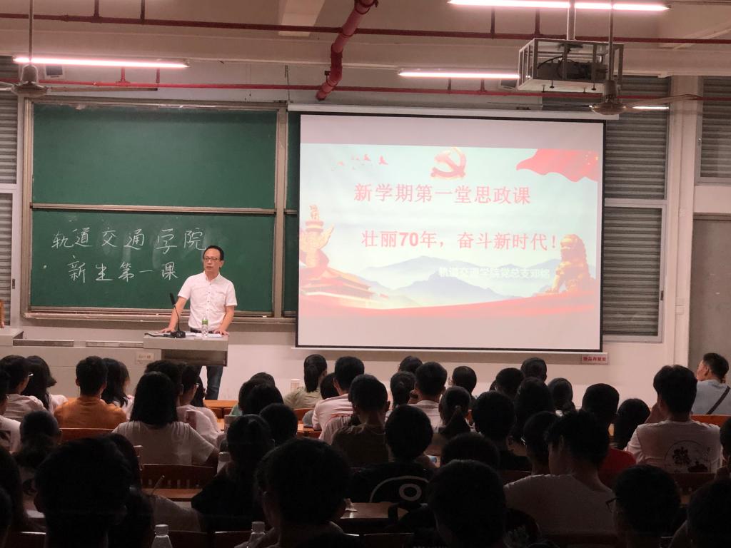 9月16日,軌道交通學院黨總支書記鄧銘在北主樓202,為2019級新生們講授了題為“壯麗70年,奮斗新時代!”的開學第一堂思政課。