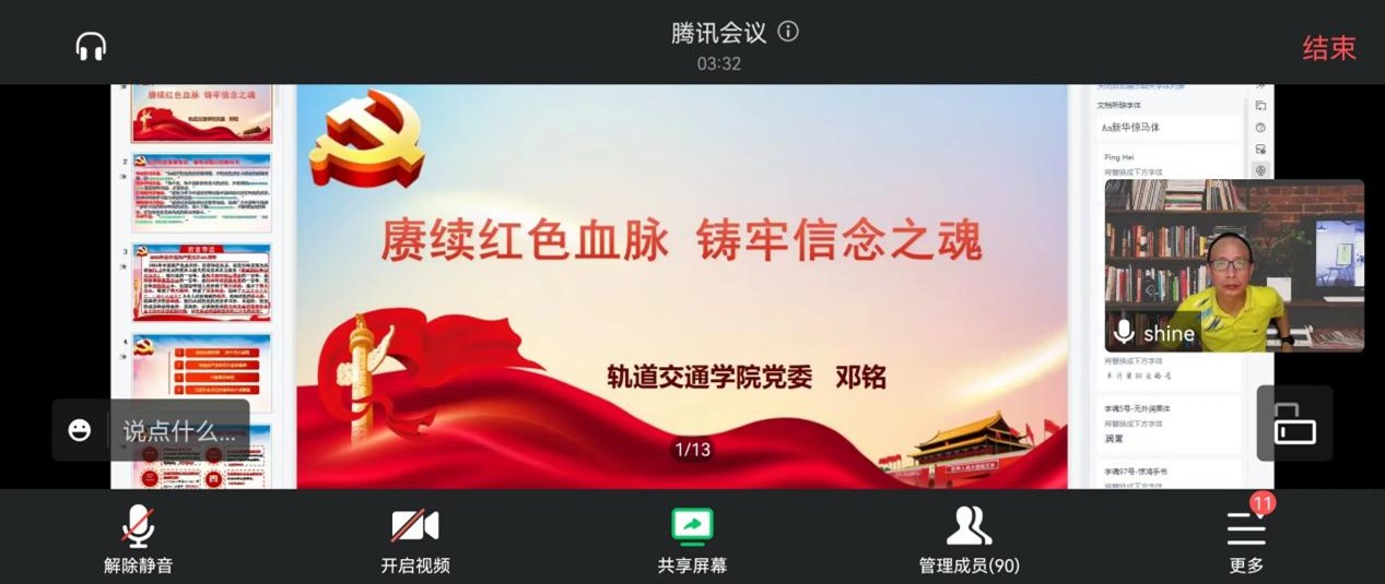 鄧銘書記以《賡續紅色血脈 鑄牢信念之魂》為主題,帶領同學們共同學習了黨的光輝歷程和四個偉大成就,結合專業特點講解了黨的十八大以來中國鐵路發展取得歷史性成就,引導大一新生將小我融入大我,牢記習近平總書記對新時代大學生朋友們的勉勵:“要將自己的命運同國家民族的命運緊緊聯系在一起”。接著講述了中國共產黨的偉大建黨精神,從劉伯堅、方志敏、趙一曼等革命英烈,鐘南山、李保國、張桂梅、黃文秀等榜樣楷模的事跡,號召同學們向英烈、楷模學習,感悟32個字的偉大建黨精神。同時學習了百年黨史中的十條寶貴經驗,要求同學們牢記習近平總書記對新時代青年的六點期望,勉勵同學們在學習工作中增強“四個意識”、堅定“四個自信”、做到“兩個維護”,做立大志、明大德、成大才、擔大任的新時代青年。