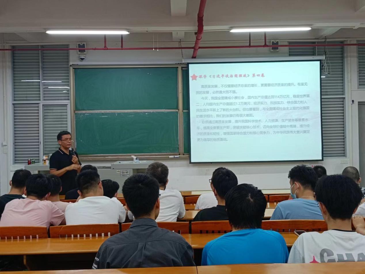 肖蒙院長以《深學第四卷 奮發新時代》為主題,通過授課引導學生深刻把握《習近平談治國理政》第四卷的豐富內涵和精神實質,學懂弄通做實習近平新時代中國特色社會主義思想。重點講述了《習近平談治國理政》第四卷中習近平總書記關于堅定不移走高質量發展之路的重要論述,“新時代新階段的發展必須貫徹新發展理念,必須是高質量發展”,“必須把發展質量問題擺在更為突出的位置,著力提升發展質量和效益”。在學習過程中勉勵研究生提高創新創業能力,奮發新時代,要積極參加創新創業實踐,有助于同學們對未來的職業發展規劃目標形成,引導同學們要將自身的前途命運與祖國發展緊密相連,堅定理想信念,志存高遠,努力奮斗。