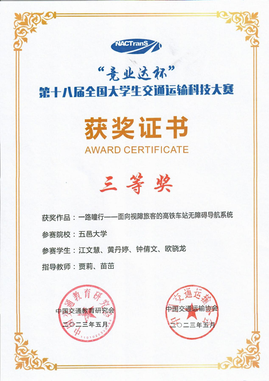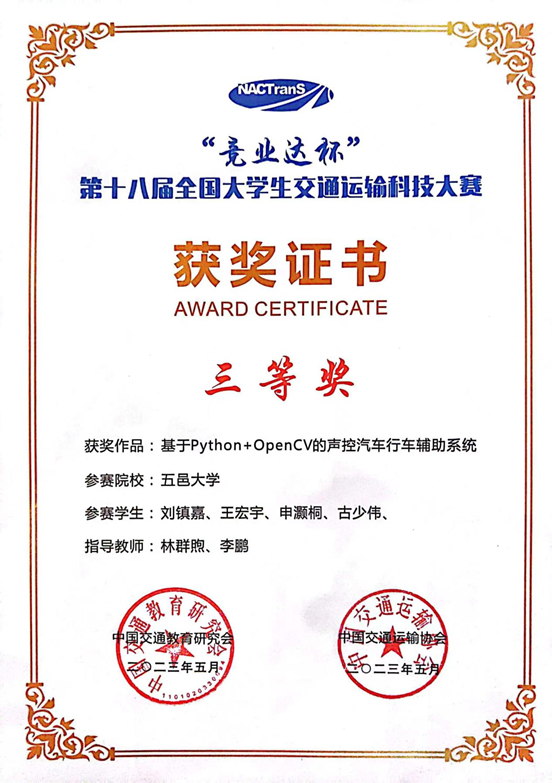 2023年5月27日,第十八屆全國大學生交通運輸科技大賽決賽在五邑大學舉行,全國86所高校進入決賽的參賽作品展開激烈角逐,軌道交通學院賈莉老師指導江文慧、黃丹婷、鐘倩文、歐驍龍等4名學生的作品“一路瞳行——面向視障旅客的高鐵車站無障礙導航系統”獲大賽三等獎,林群煦、李鵬老師指導劉鎮嘉、王宏宇、申灝桐、古少偉等4名學生的作品“基于Python+OpenCV的聲控汽車行車輔助系統”獲大賽三等獎,取得我院自2014年建院以來的最好成績,實現了獲獎零的突破。