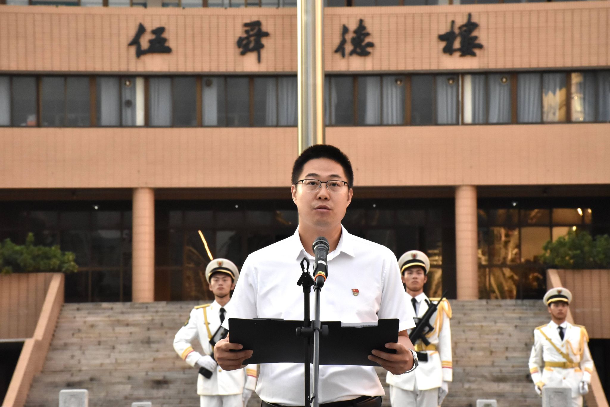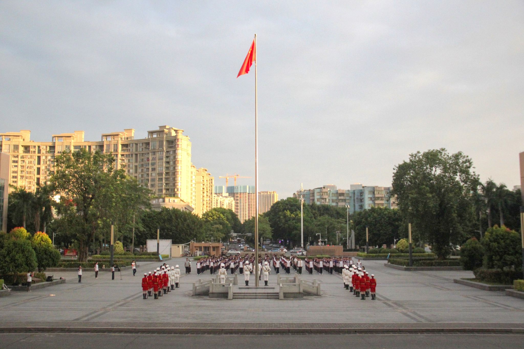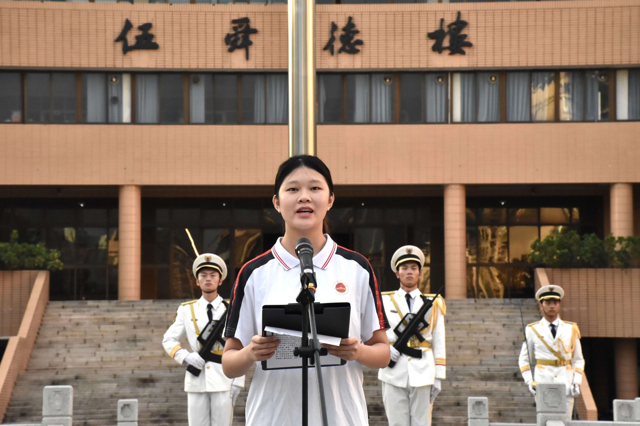 升國旗儀式正式開始前,全體師生列隊整齊。在國旗護衛隊鏗鏘有力、整齊劃一的步伐中,迎國旗,行注目禮,齊唱國歌,五星紅旗冉冉升起。