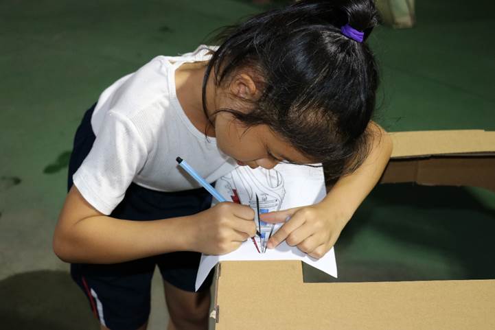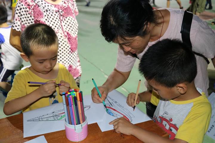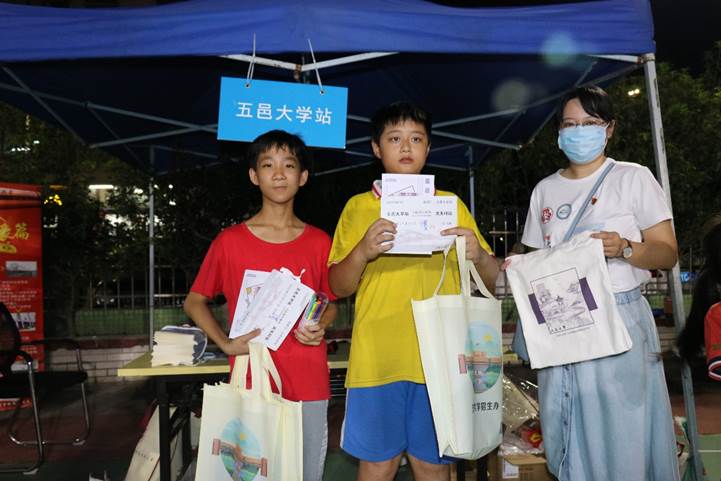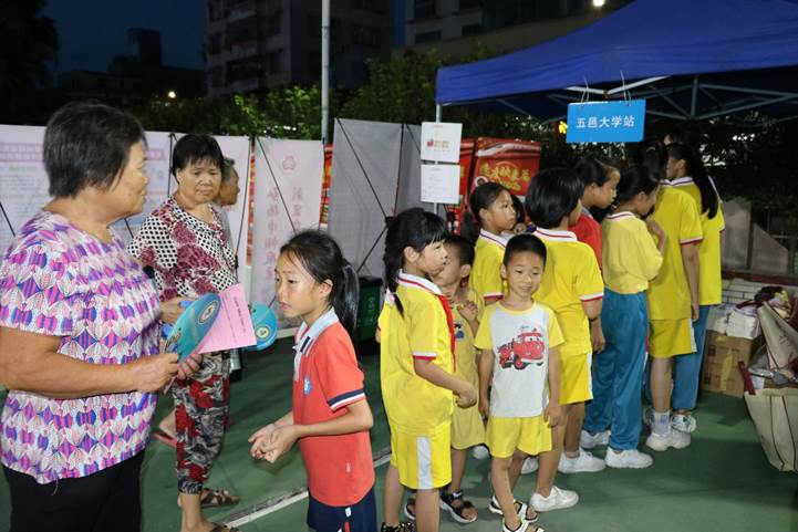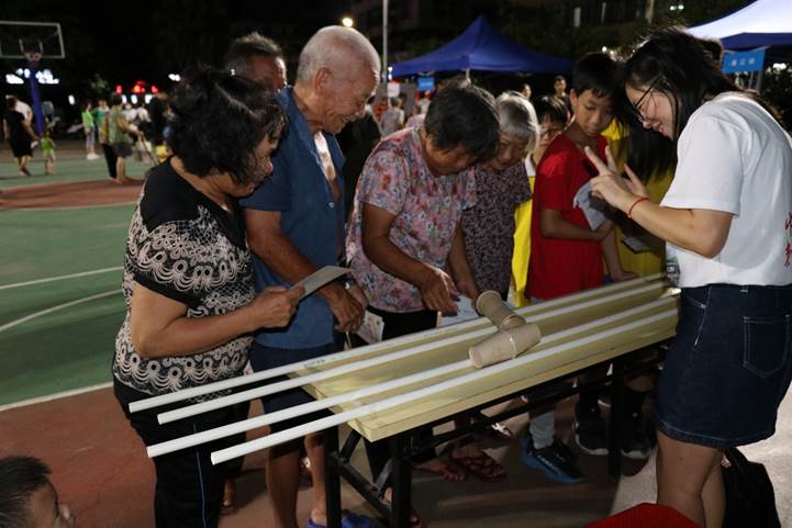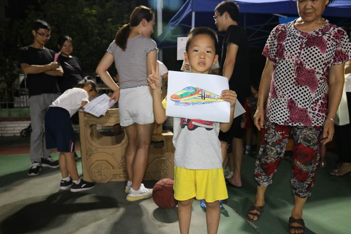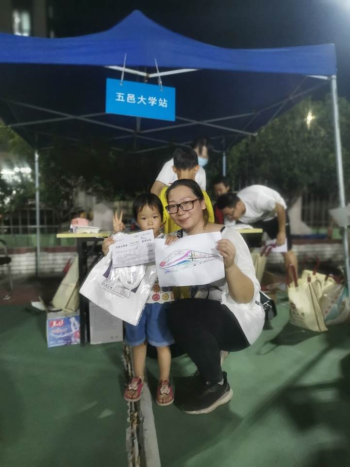 籃球場上多了一排小小的、藍色的、神秘的“火車站”,每座“火車站”前都人頭攢動,整座籃球場充滿著歡聲笑語。村民們在始發站——“五邑大學站”可以領取一張特別的“火車票”,然后可以旅行到“蓬江站”涂畫自己心目中的高鐵列車、到“江海站”用拼圖拼出奇妙的火車隧道盾構機、到“禮樂站”進行火車自導向科學小實驗、到“武東村站”回答火車科普小問題,還可以到小舞臺上一展歌喉、唱一唱關于火車的歌曲。村民們每旅行到一個車站,便可以參加一項互動游戲,完成任務后便可獲得相應的積分印花,最后折返回“五邑大學站”兌換精美的獎品。