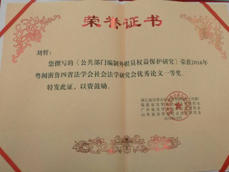 11月26日,魯浙閩粵四省法學會社會法學研討會2016年聯會暨浙江省法學會社會法學研究會第二屆會員大會在溫州大學隆重舉行,會議由溫州大學法政學院、溫州市社會科學界聯合會、溫州市法學會社會法學研究會承辦。來自山東、浙江、福建、廣東、北京、吉林、遼寧、江蘇、上海等省市和我國臺灣地區、美國密蘇里大學哥倫比亞校區的特邀代表近100人參會,我校政法學院院長、廣東省法學會社會法學研究會副會長王繼遠博士攜政法學院劉哲、翁凱二位本科生應邀參會。此次會議的主題為“共享發展與社會法治”, 大會分三個分論壇進行專題研討,大會共收到論文近80篇。王繼遠博士還擔任第二組“社會保障法前沿問題”分小組會議的評議人,劉哲同學應邀在大會上作主題發言。會議還評選出優秀論文一、二、三等獎,由王繼遠博士指導,我校本科生劉哲同學所撰寫的論文《公共部門編制外職員權益保護研究》經過嚴格的匿名評審,被評為本屆聯會優秀論文一等獎。(文/圖 政法學院)