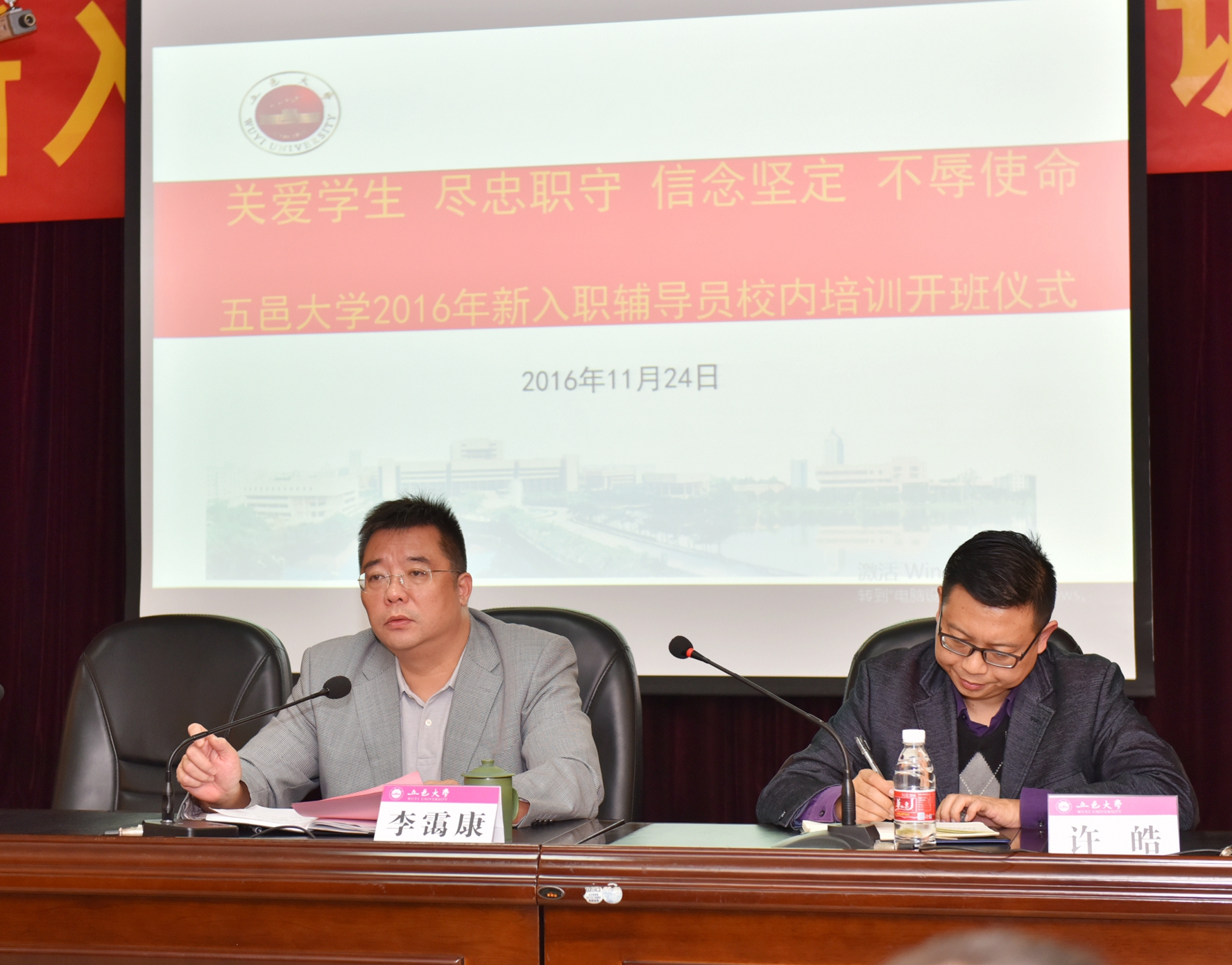 11月24日下午,我校2016年新入職輔導(dǎo)員培訓(xùn)開班儀式在南主樓7樓大會議室召開,出席會議的人員有校黨委副書記李靄康同志、各學(xué)院黨總支書記、副書記以及全體輔導(dǎo)員老師。會議由許皓處長主持。