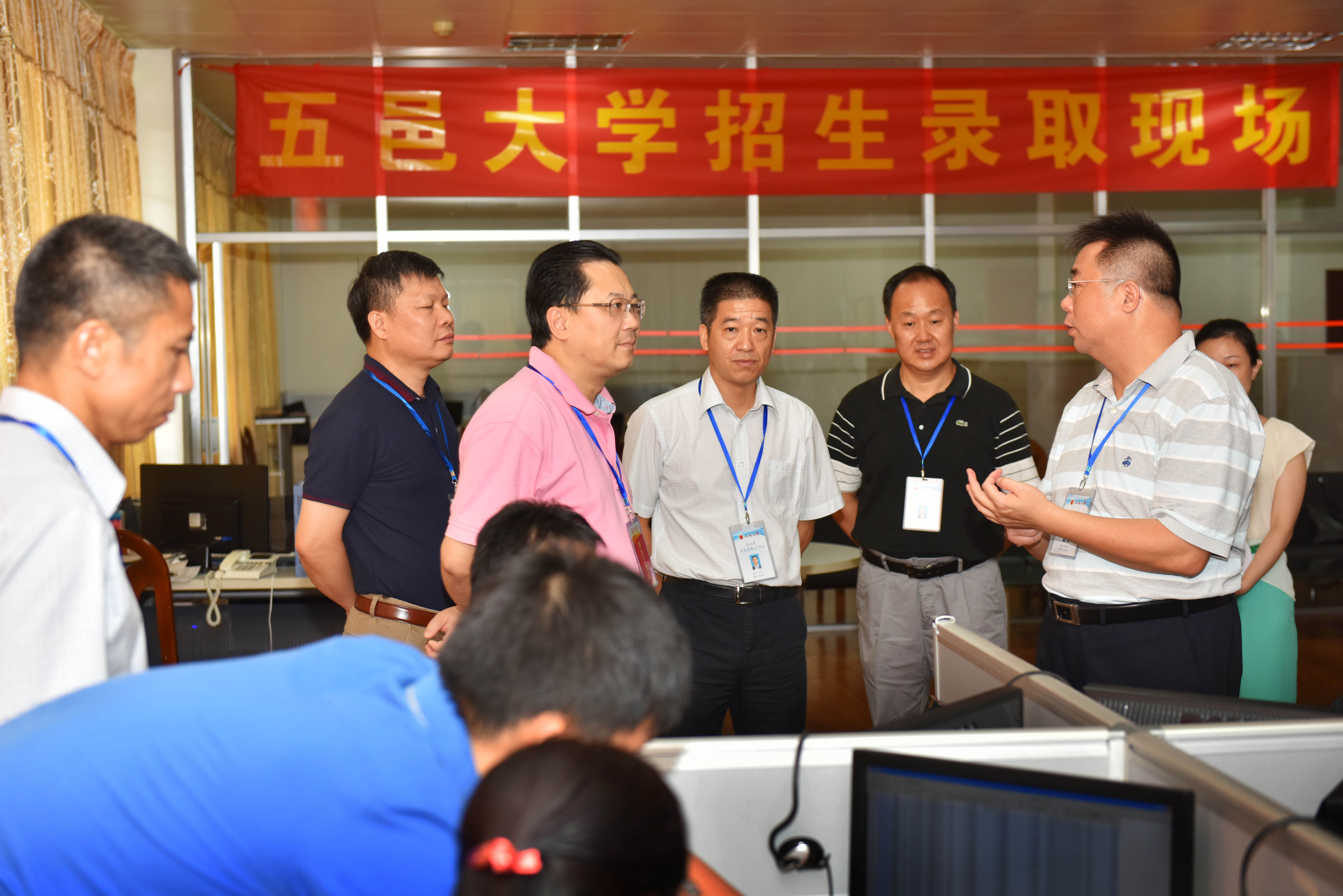 7月21日,江門市副市長吳國杰一行來我校招生錄取工作現場,檢查指導2016年招生錄取工作。校長張運華、黨委副書記羅清旭、黨委副書記李靄康、副校長李霆及招生辦負責人等向市領導匯報了學校今年招生工作有關情況。