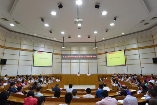 11月17日下午,學校在十友樓二樓國際會議廳舉行2015年紀律教育學習月輔導報告會。黨委書記張焜同志作了《關于中國共產黨章程》(以下簡稱《黨章》)、《中國共產黨廉潔自律準則》(以下簡稱《準則》)和《中國共產黨紀律處分條例》(以下簡稱《條例》)的學習輔導報告,黨委副書記、紀委書記羅清旭同志主持報告會。全體科級以上干部參加了會議。