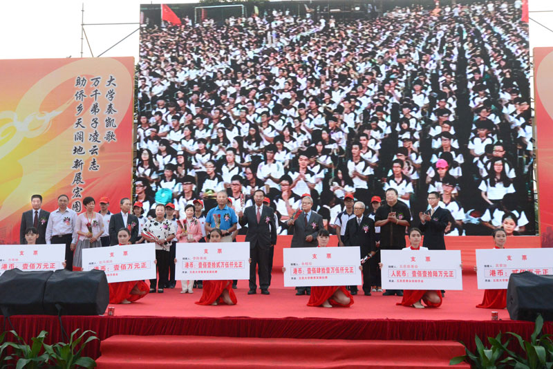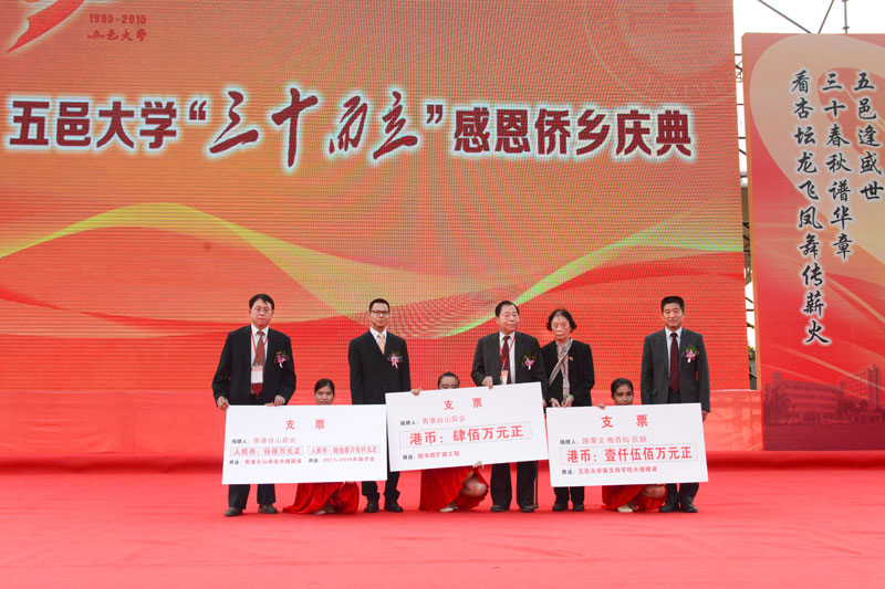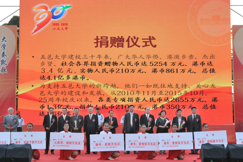 在建校30周年之際,為感恩僑鄉(xiāng),銘記開(kāi)拓者順應(yīng)改革浪潮、重教興學(xué)、艱苦創(chuàng)業(yè)、無(wú)私奉獻(xiàn)的傳統(tǒng),學(xué)校決定授予為建校艱苦創(chuàng)業(yè)、為學(xué)校發(fā)展傾力相助的個(gè)人和單位五邑大學(xué)"三十而立"開(kāi)拓者紀(jì)念章和功德紀(jì)念章。王屏山、葉家康、呂志和、利國(guó)偉、黃球、黎子流等67人獲得"三十而立"開(kāi)拓者紀(jì)念章;利國(guó)偉易海倫伉儷、伍舜德馬蘭芳伉儷、呂志和等56人,五邑大學(xué)教育基金(香港)有限公司、香港臺(tái)山商會(huì)、五邑慈善會(huì)等15家單位獲"三十而立"功德紀(jì)念章。據(jù)統(tǒng)計(jì),學(xué)校建校30年來(lái),廣大華人華僑、港澳鄉(xiāng)親、杰出鄉(xiāng)賢、社會(huì)各界大力支持學(xué)校建設(shè),捐資贈(zèng)物總值達(dá)4億多港元,其中,從2010年25周年校慶以來(lái),捐資贈(zèng)物總值達(dá)2.1億港元。(文/圖 宣傳部)