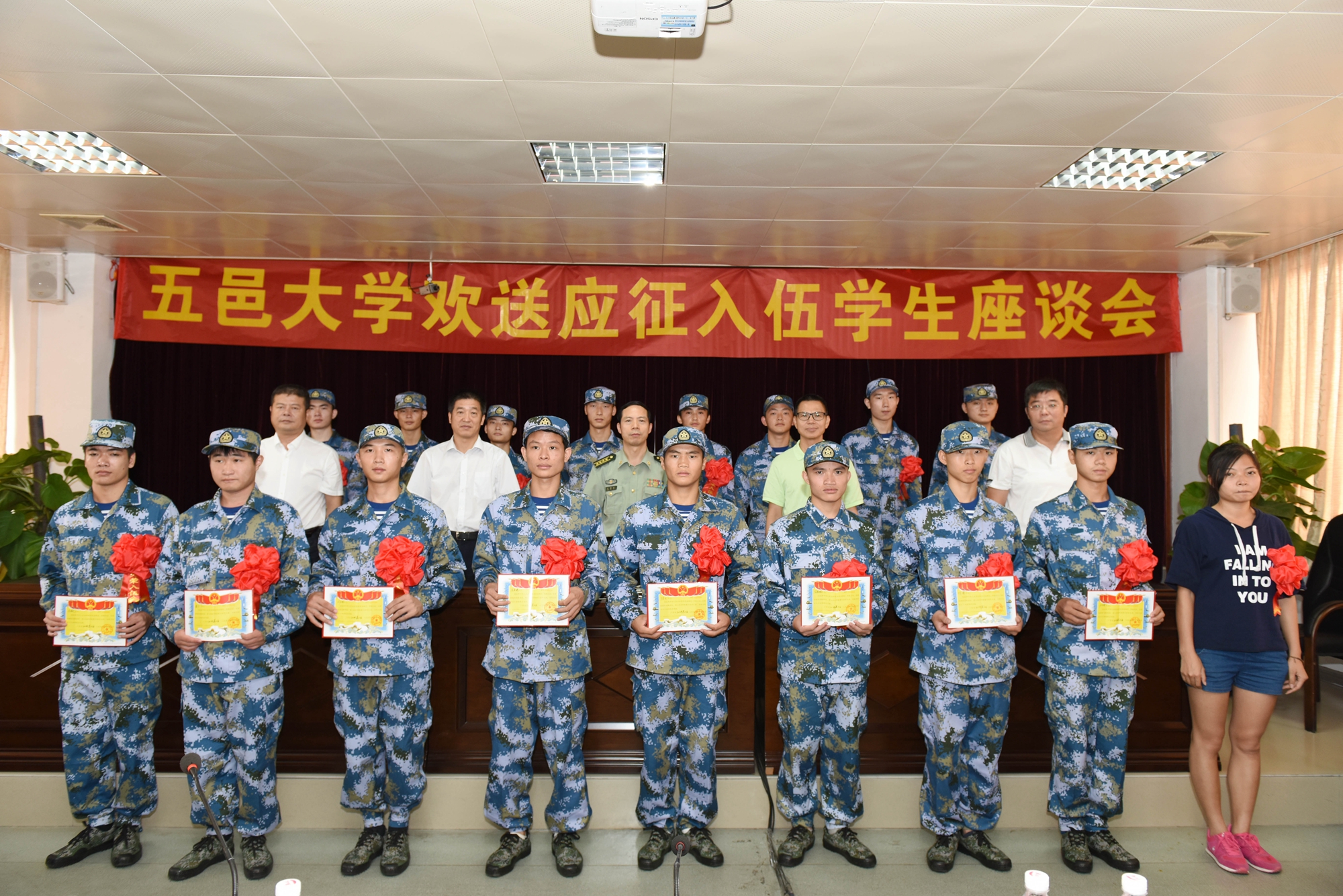 在歡送座談會上,軍分區(qū)領導和學校領導為17名入伍學生頒發(fā)了入伍通知書,并親手為他們佩戴大紅花。張焜書記、張耀斌政委和張運華校長分別發(fā)表講話。張焜書記在講話中對光榮入伍的學生表示祝賀,希望入伍的同學遵守部隊紀律,加強學習,安心服役,接受鍛煉,苦練軍事技能,獻身國防事業(yè),勇創(chuàng)佳績。張耀斌政委寄語入伍的大學生們盡快適應軍營生活,刻苦訓練,忠于職守,聽從指揮,發(fā)揮自己的聰明才智,為五邑大學、為江門增光添彩。他還肯定了五邑大學對國防建設的支持。張運華校長勉勵入伍同學以當兵的自豪感來鞭策自己,通過軍營生活證明自己是優(yōu)秀的,接受軍營這個大熔爐的鍛煉,成長成才。