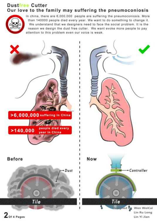 “無(wú)塵切割機(jī)”在小型手持式切割機(jī)頂部擰上一個(gè)裝水的小可樂(lè)瓶,在工人用切割機(jī)打磨大理石及瓷磚時(shí),有效防止塵土飛揚(yáng),保護(hù)了工人的肺部健康。其設(shè)計(jì)靈感源于溫為才老師在家中更換煤氣灶時(shí),看到了工人在切割大理石灶臺(tái)時(shí)產(chǎn)生了大量粉塵而偶然萌生了這個(gè)創(chuàng)意。溫為才老師與工業(yè)設(shè)計(jì)專業(yè)林如龍同學(xué)及產(chǎn)品設(shè)計(jì)專業(yè)林毅堅(jiān)同學(xué)花費(fèi)將近一年的時(shí)間完成了所有的結(jié)構(gòu)設(shè)計(jì),造型設(shè)計(jì)以及樣品制作。