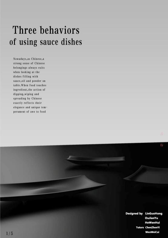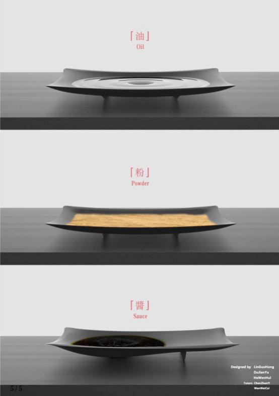 “三行” 醬料碟的設(shè)計(jì)過(guò)程中,由林國(guó)鴻、歐堅(jiān)裕以及何文輝三位同學(xué)在陳振益老師指導(dǎo)下,花費(fèi)了近一年多的時(shí)間對(duì)飲食文化進(jìn)行了研究,對(duì)不同的醬料以及對(duì)大眾蘸醬的動(dòng)作進(jìn)行了細(xì)膩的分析,提出了《點(diǎn)》,《抹》《鋪》三個(gè)醬料碟設(shè)計(jì),將不同的醬料用不同的碟子盛放,改變了傳統(tǒng)的飲食習(xí)慣,提升了飲食過(guò)程的用戶體驗(yàn)。