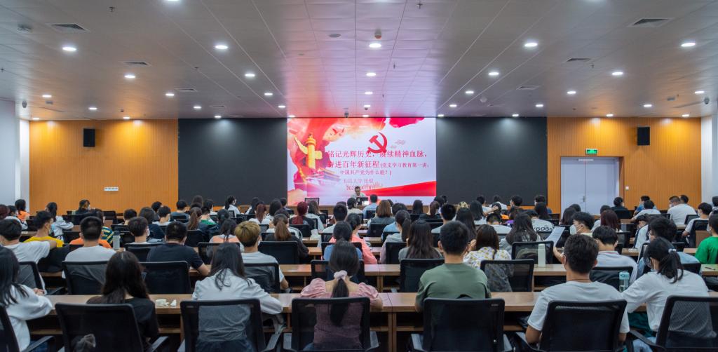 張焜從回望百年征程,以史明志,牢記初心使命;深刻認(rèn)識(shí)中國共產(chǎn)黨為什么能,不斷增強(qiáng)理想信念;擔(dān)當(dāng)時(shí)代責(zé)任,續(xù)寫黨史新百年輝煌三個(gè)方面闡述了中國共產(chǎn)黨從一葉扁舟成長為巍巍巨輪的光輝歷程。張焜帶領(lǐng)同學(xué)們回顧了近代中國內(nèi)憂外患、積貧積弱的時(shí)代背景下,各個(gè)階層尋找國家出路但最后都?xì)w于失敗的歷程,由此引導(dǎo)學(xué)生認(rèn)識(shí)中國共產(chǎn)黨誕生的歷史邏輯,從馬克思主義的理論指導(dǎo),為中國人民謀幸福和為中華民族謀復(fù)興的初心使命,嚴(yán)密的組織體系和嚴(yán)明的組織紀(jì)律,堅(jiān)定而崇高的理想信念,堅(jiān)持勇于自我革命,不斷自我凈化、自我完善、自我革新、自我提高等五個(gè)維度充分闡釋了中國共產(chǎn)黨歷經(jīng)百年風(fēng)雨卻能夠長盛不衰的根本原因。