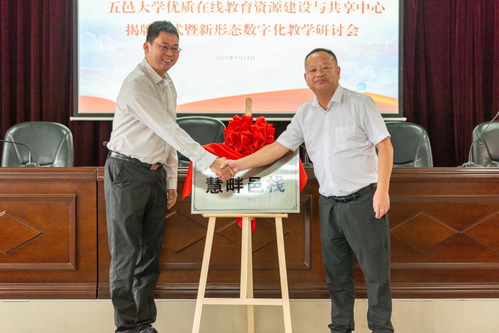 為加快高質(zhì)量課程資源建設(shè),助推學(xué)校數(shù)字化轉(zhuǎn)型,9月14日,五邑大學(xué)優(yōu)質(zhì)在線教育資源建設(shè)與共享中心——“慧畔邑棧”揭牌成立。智慧樹網(wǎng)副總裁陳弘、智慧樹網(wǎng)華南區(qū)域總監(jiān)高悅,五邑大學(xué)副校長(zhǎng)董超俊、相關(guān)職能部門負(fù)責(zé)人、學(xué)校省級(jí)以上一流課程負(fù)責(zé)人等參加揭牌儀式。儀式由教務(wù)處處長(zhǎng)趙雨旸主持。