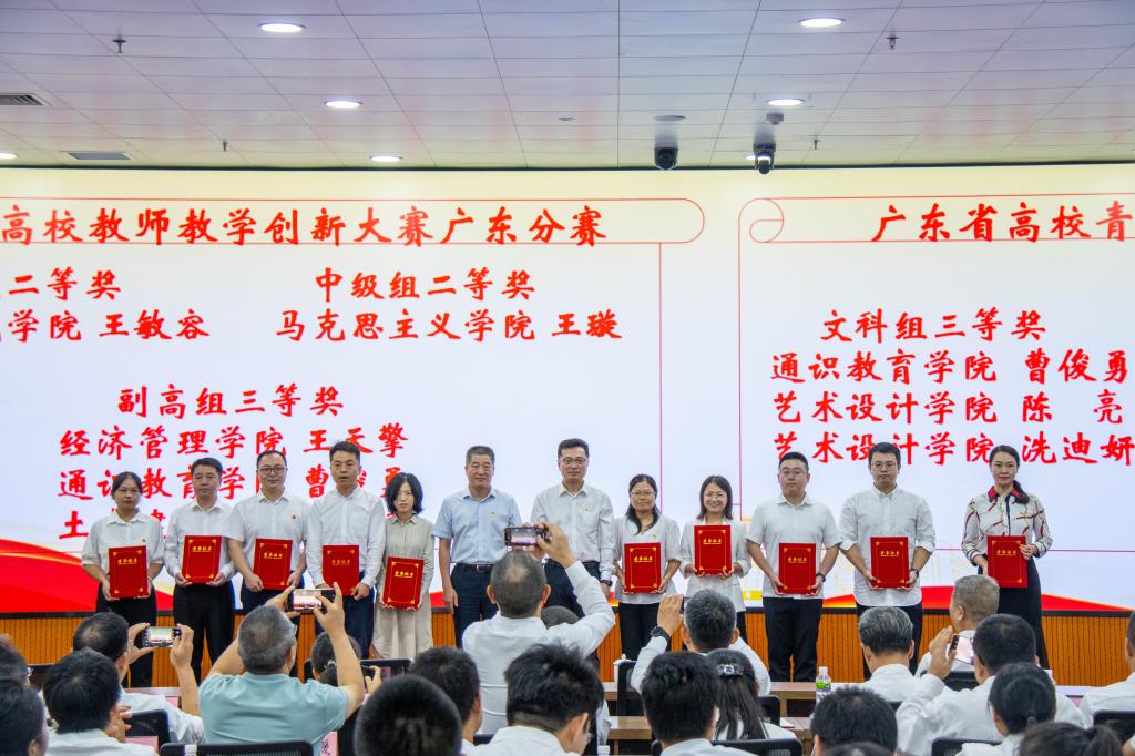 在表彰大會上,校黨委書記欒天罡、校長張運華為2023年度30年教齡教師頒發了榮譽證書,對他們長期以來為學校教育事業的辛勤付出表示感謝,希望他們牢記初心,落實立德樹人根本任務,為學校高質量發展作出更大的貢獻。同時,校黨委書記欒天罡、校長張運華為在全國高校教師教學創新大賽、廣東省高校青年教師教學大賽獲獎的10位教師頒發了獲獎證書,號召新教師要向獲獎教師學習,堅守教育初心,擔當育人使命,努力提升專業素養,在學校教育教學中勇創佳績。