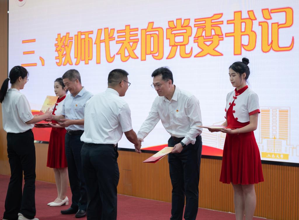 “我志愿成為一名人民教師,忠誠黨的教育事業,依法履行教師職責……為教育發展、國家繁榮和民族振興努力奮斗!”在領誓人、青年教師李陽的帶領下,舉起右拳的新教師們面向國旗發出莊嚴誓言,鏗鏘有力,彰顯新教師“躬耕教壇、強國有我”的決心。