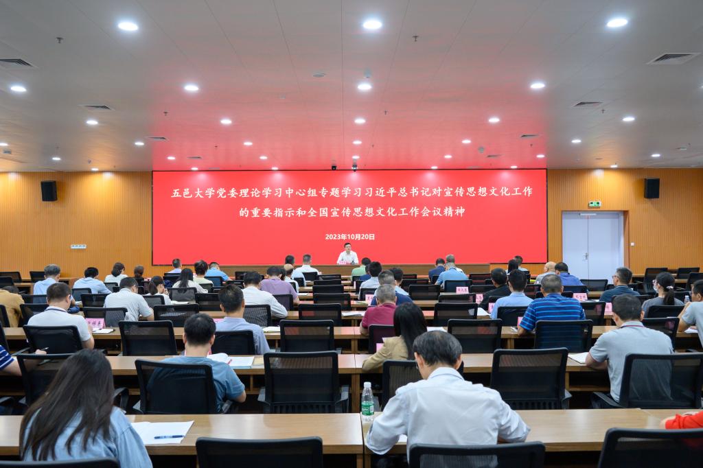 會(huì)議要求,要認(rèn)真學(xué)習(xí)貫徹習(xí)近平總書記重要指示精神,深入學(xué)習(xí)貫徹習(xí)近平文化思想,按照全國宣傳思想文化工作會(huì)議的部署要求,以釘釘子精神把各項(xiàng)任務(wù)要求落到實(shí)處,不斷增強(qiáng)工作能力本領(lǐng),提高工作質(zhì)量效能,努力把學(xué)習(xí)成果轉(zhuǎn)化為推動(dòng)學(xué)校宣傳思想文化工作高質(zhì)量發(fā)展的生動(dòng)實(shí)踐,在建設(shè)社會(huì)主義文化強(qiáng)國、建設(shè)中華民族現(xiàn)代文明的奮斗和實(shí)踐中展現(xiàn)五邑大學(xué)的新?lián)?dāng)、新作為。一是在深學(xué)細(xì)悟中強(qiáng)化理論武裝。要把深入學(xué)習(xí)貫徹習(xí)近平文化思想作為當(dāng)前和今后一個(gè)時(shí)期的重要政治任務(wù),迅速有力組織廣大黨員干部師生深入學(xué)習(xí)領(lǐng)會(huì)習(xí)近平文化思想的重大意義、豐富內(nèi)涵和實(shí)踐要求,深刻領(lǐng)悟“兩個(gè)確立”的決定性意義,增強(qiáng)“四個(gè)意識(shí)”、堅(jiān)定“四個(gè)自信”、做到“兩個(gè)維護(hù)”,持續(xù)在真學(xué)真懂真信真用、深化內(nèi)化轉(zhuǎn)化上下功夫、見實(shí)效。二是在知行合一中勇?lián)?zé)任使命。要切實(shí)增強(qiáng)做好新時(shí)代新征程宣傳思想文化工作的責(zé)任感使命感,持續(xù)加強(qiáng)對(duì)習(xí)近平文化思想的學(xué)習(xí)、研究、闡釋,用好這一強(qiáng)大思想武器和科學(xué)行動(dòng)指南,自覺貫徹落實(shí)到宣傳思想文化工作各方面和全過程,同落實(shí)立德樹人根本任務(wù)結(jié)合起來,同推動(dòng)新型高水平理工科大學(xué)建設(shè)貫通起來,推動(dòng)新文科建設(shè),擦亮僑校底色,突出鮮明僑文化特色,筑牢宣傳思想文化陣地,為答好“廣東需要什么樣的五邑大學(xué),支撐廣東發(fā)展五邑大學(xué)有何新作為”的新課題注入強(qiáng)大的精神力量。三是在奮斗實(shí)干中展現(xiàn)新氣象新作為。要加強(qiáng)黨對(duì)宣傳思想文化工作的全面領(lǐng)導(dǎo),學(xué)校各級(jí)黨組織要把做好宣傳思想文化工作作為重大政治責(zé)任扛在肩上,領(lǐng)導(dǎo)干部要做實(shí)干家,也要做宣傳家,確保黨中央關(guān)于文化建設(shè)的決策部署落到實(shí)處。學(xué)校宣傳思想文化相關(guān)部門要強(qiáng)化政治擔(dān)當(dāng),勇于改革創(chuàng)新,敢于善于斗爭,不斷開創(chuàng)新時(shí)代學(xué)校宣傳思想文化工作新局面。(文/圖 宣傳部)