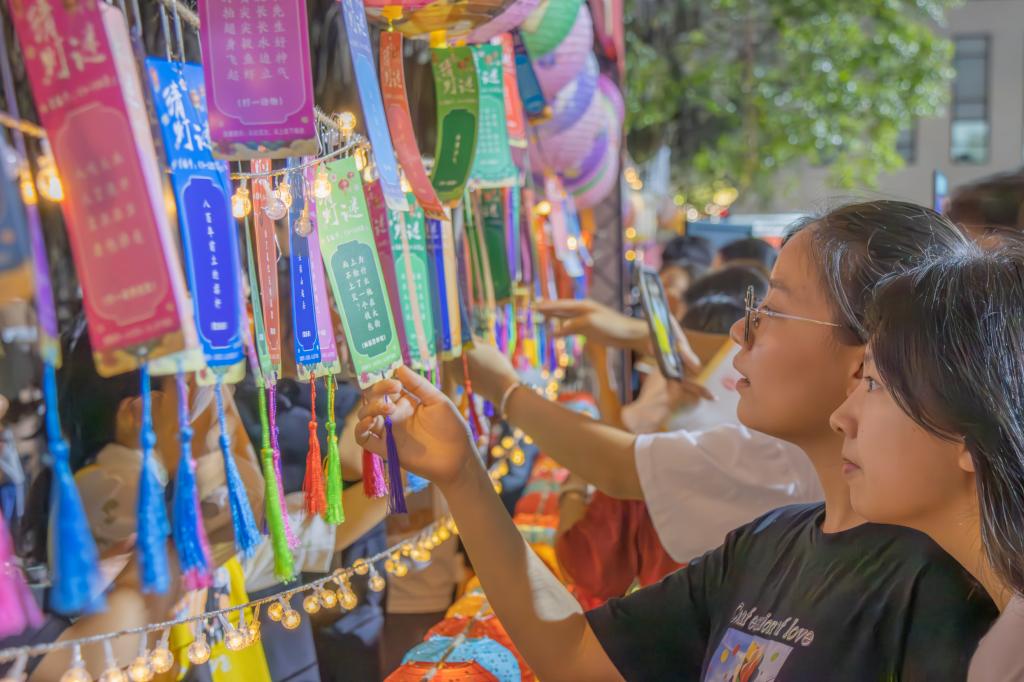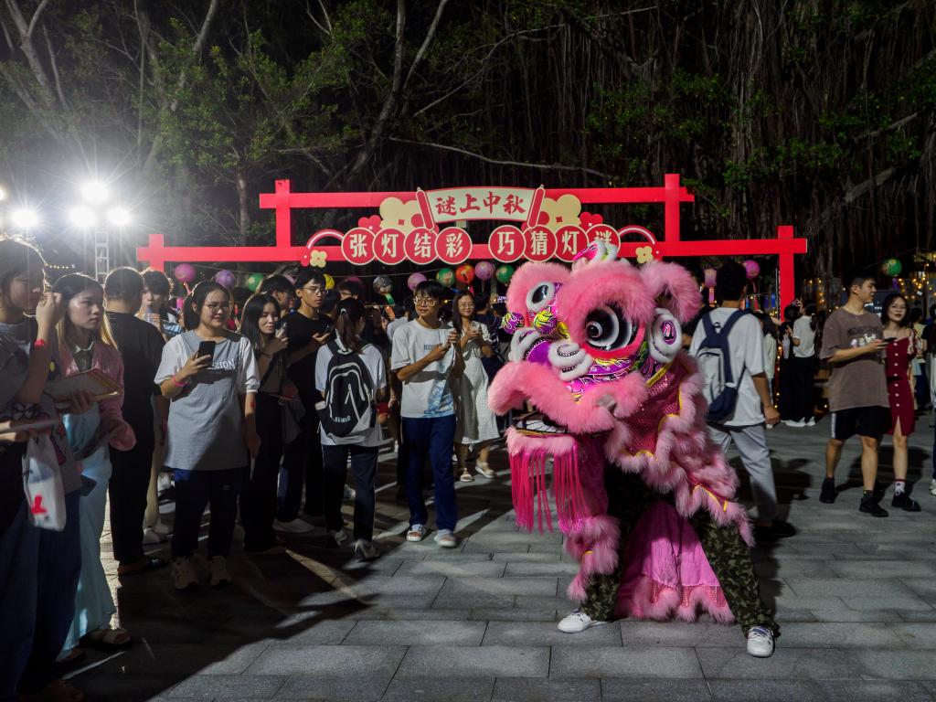 游園會設(shè)置學(xué)校僑捐建筑集章兌禮、猜燈謎、筆墨留香體驗、燈籠手作、傳統(tǒng)服飾打卡、飛花令、賞月觀星、投壺游戲、圖書展、社團(tuán)表演和現(xiàn)場演出等環(huán)節(jié)。現(xiàn)場氣氛熱烈,同學(xué)們著中華傳統(tǒng)服飾,在游園會中賞明月、嘗月餅、看花燈、猜燈謎、扎燈籠、品詩詞,體驗中秋節(jié)傳統(tǒng)習(xí)俗。