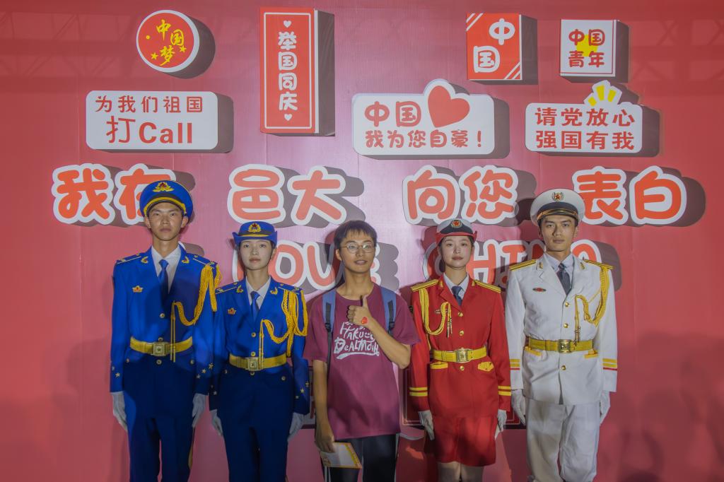 活動現(xiàn)場設(shè)置了向祖國真情告白的打卡點和國旗護(hù)衛(wèi)隊展示區(qū),同學(xué)們爭相在打卡點拍照、發(fā)朋友圈,在中華人民共和國成立74周年之際向祖國送上真摯的祝福。