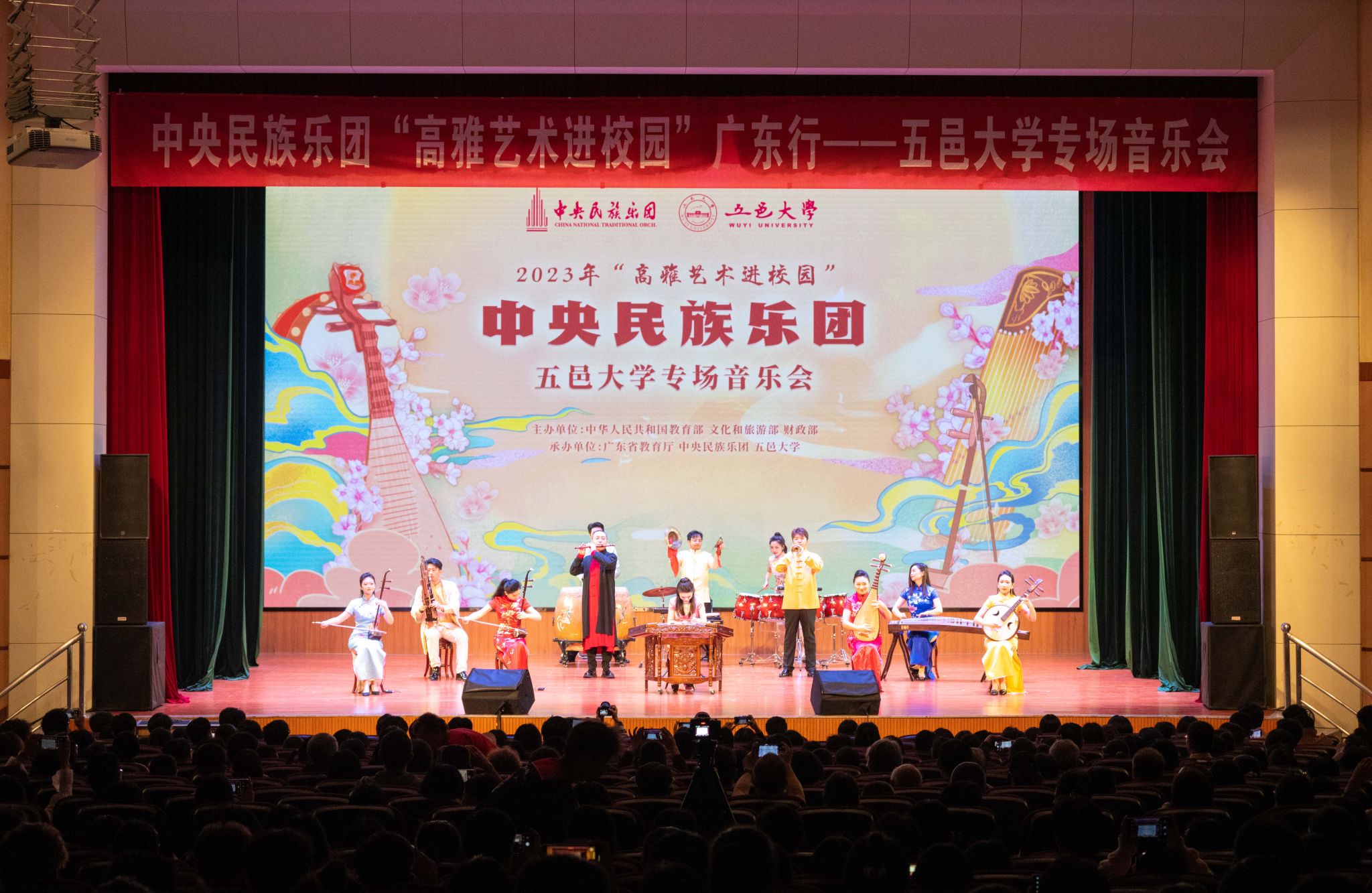 為深入學習貫徹習近平文化思想,全面貫徹黨的二十大關于文化建設的戰略部署,進一步強化學校美育育人功能,落實立德樹人根本任務,傳承和弘揚中華優秀傳統文化和中華美育精神,11月22日晚,由教育部、文化和旅游部、財政部主辦,廣東省教育廳、中央民族樂團、五邑大學承辦的2023年“高雅藝術進校園”活動暨中央民族樂團走進廣東高校第二站——五邑大學專場音樂會在學校呂志和禮堂舉行。五邑大學副校長周飚、副校長董超俊,逾千名師生參加音樂會,共賞這場美妙絕倫的國樂盛宴。