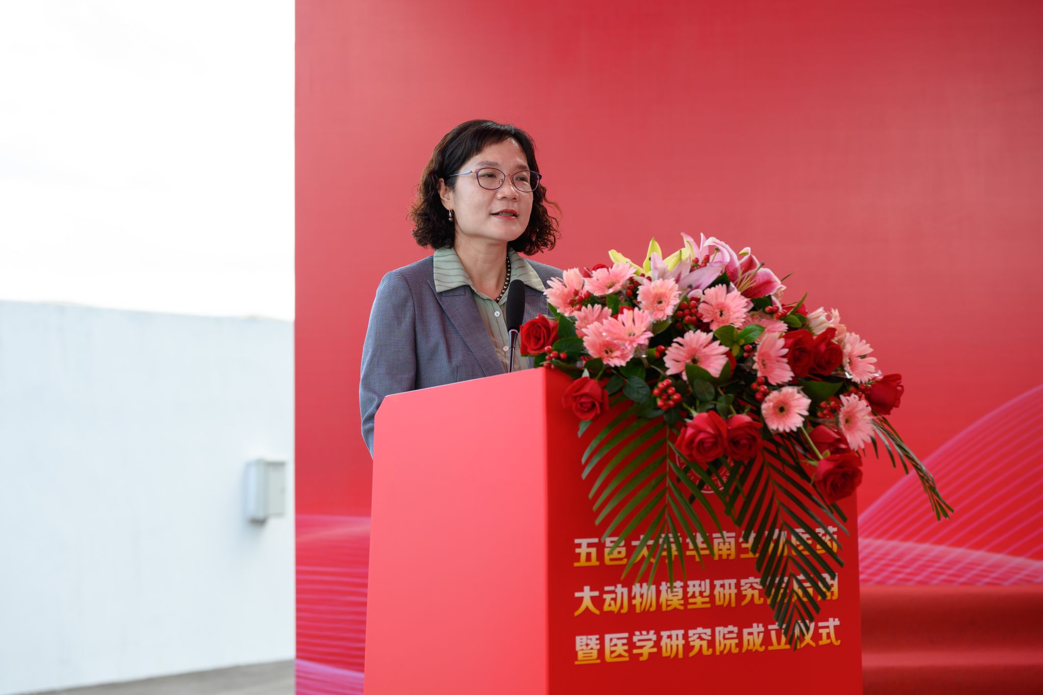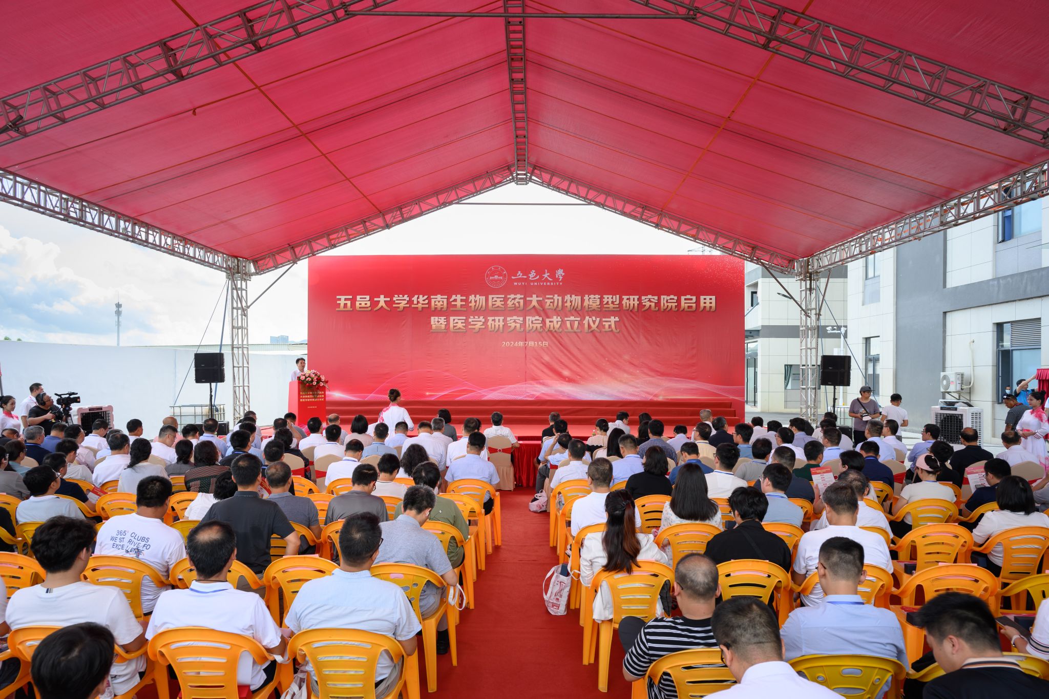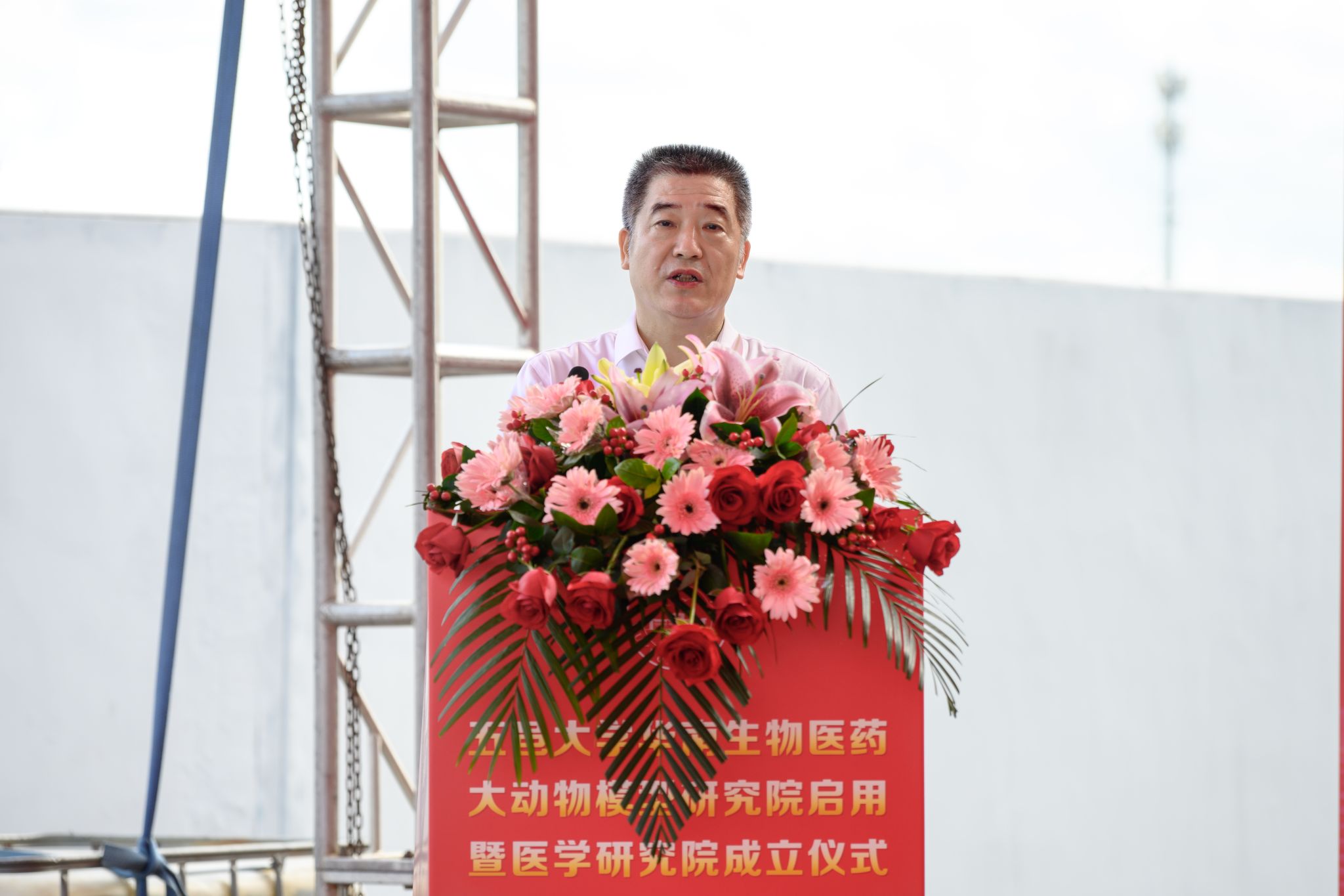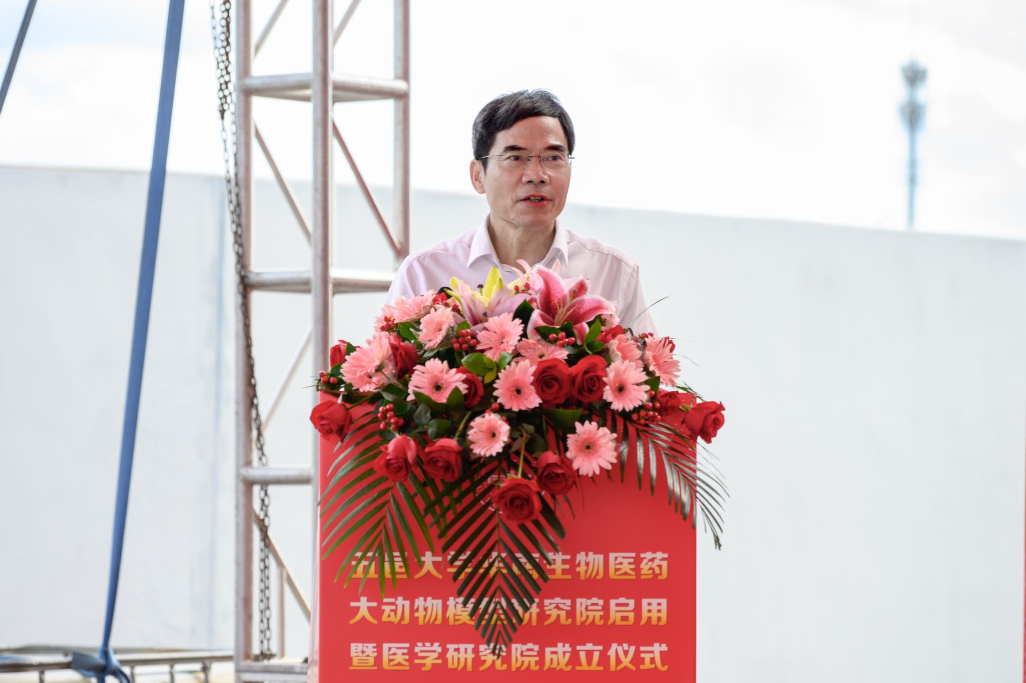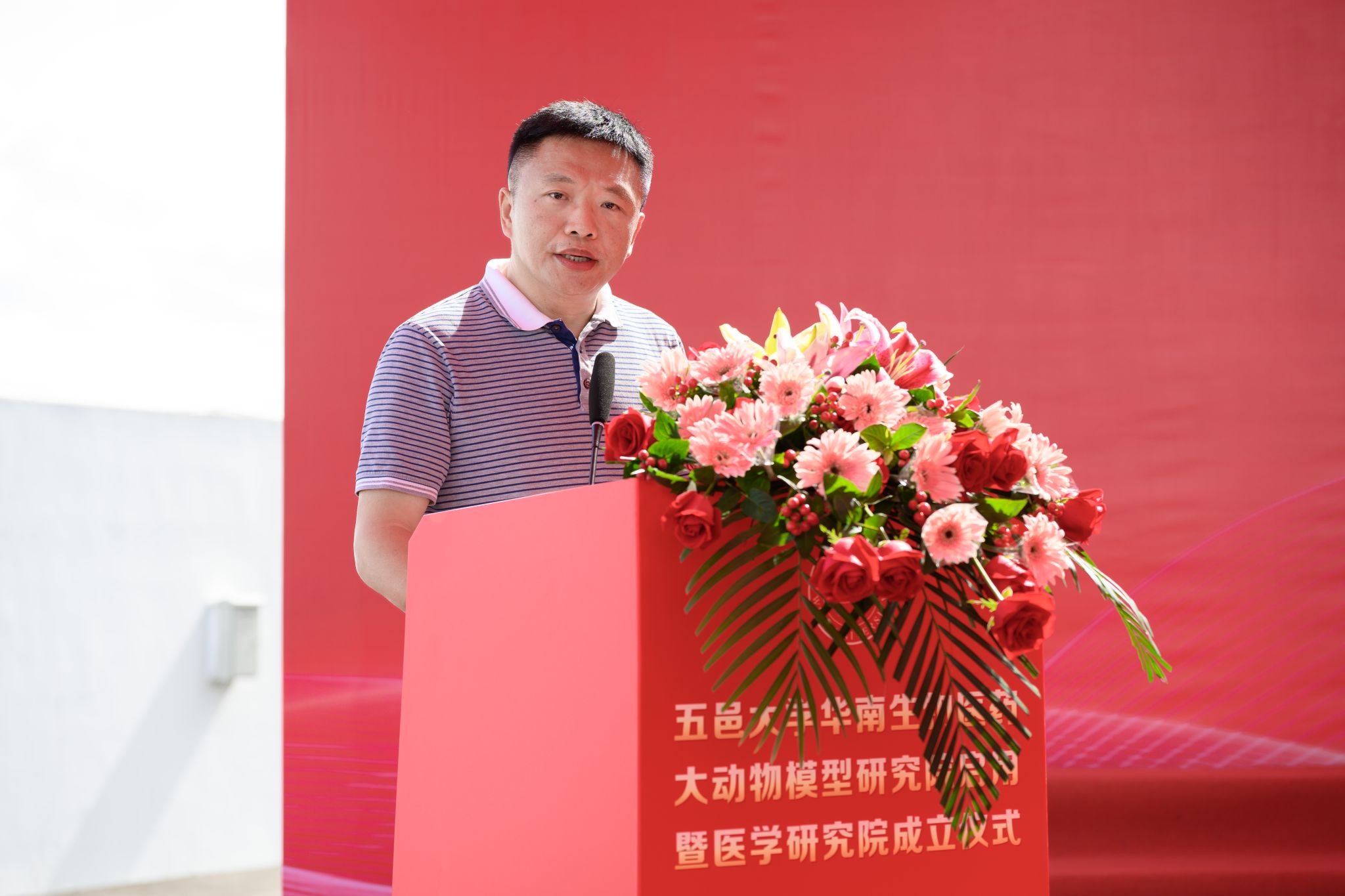 7月15日上午,五邑大學在江門鶴山市舉行華南生物醫藥大動物模型研究院啟用暨醫學研究院成立儀式。中國工程院院士印遇龍;廣東省科學技術廳二級巡視員龔建文,廣州實驗室副主任陳新文,中國科學院廣州生物醫藥與健康研究院副院長蔡陳崚,廣東省林業局動植物處一級調研員李秋明,廣東省實驗動物監測所所長朱才毅;江門市副市長周佩珊,江門海關副關長、黨委委員詹水旭及其他相關單位負責同志;暨南大學副校長洪岸等;五邑大學黨委書記欒天罡,黨委副書記、校長張運華,黨委常委、副校長周飚以及相關部門負責人參加活動。活動由校黨委常委、副校長陳文華主持。