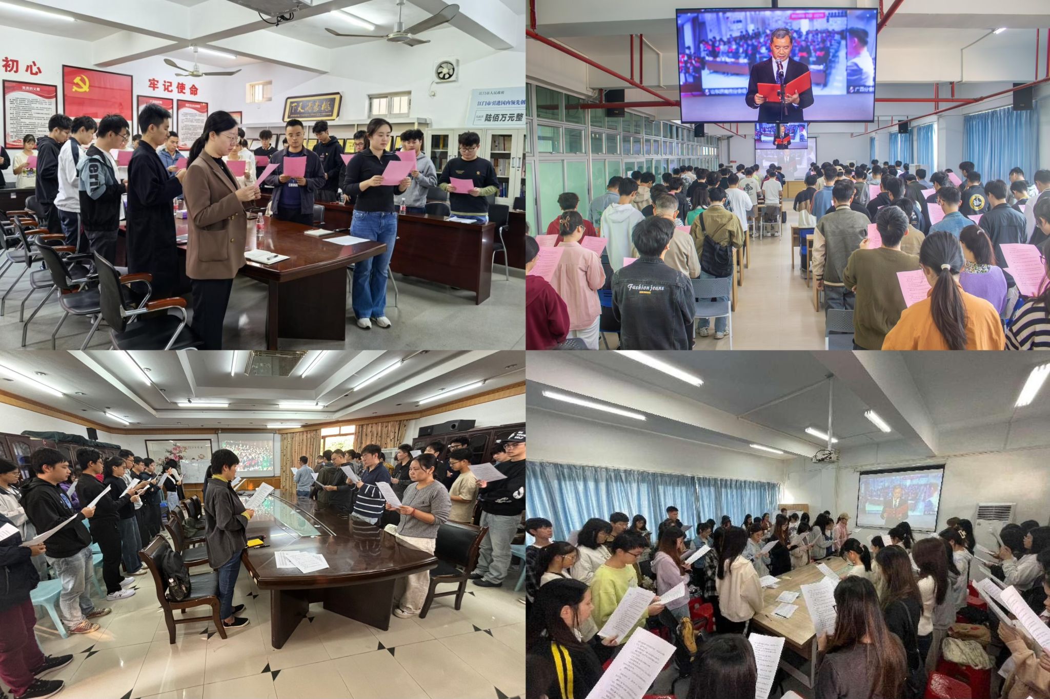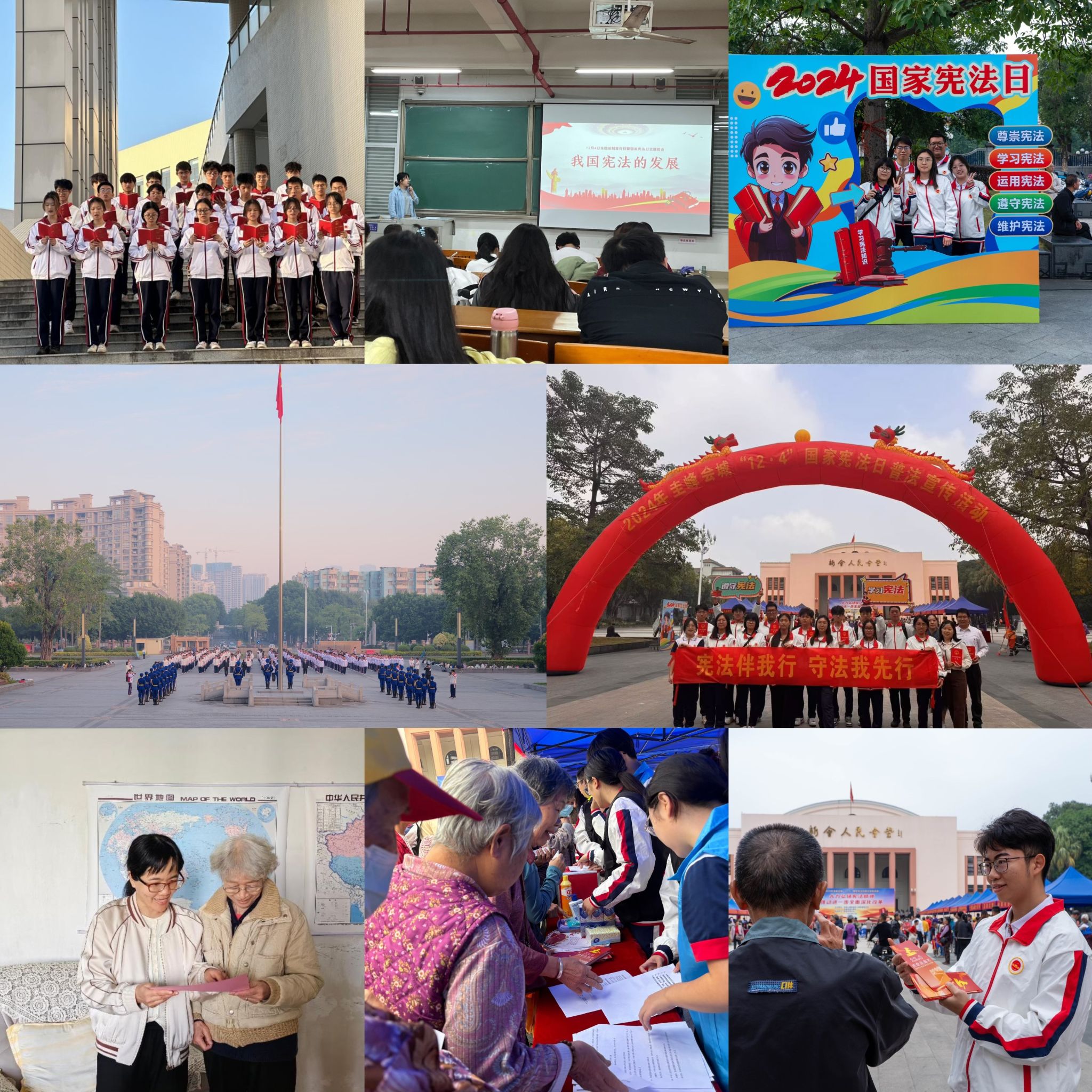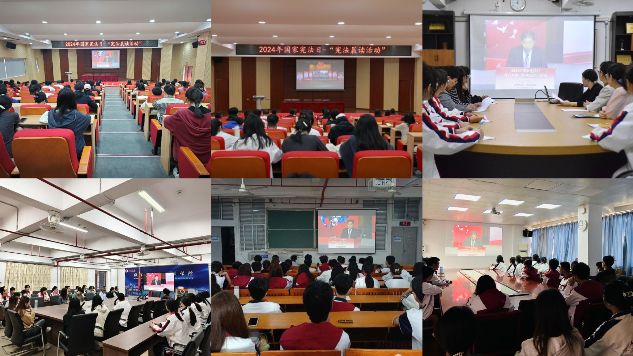 學(xué)校高度重視憲法宣傳教育工作,組織各單位認(rèn)真學(xué)習(xí)、縱深推進(jìn)。政法學(xué)院黨委理論學(xué)習(xí)中心組組織開(kāi)展憲法宣傳教育專題學(xué)習(xí),深入學(xué)習(xí)憲法的基本原則、核心內(nèi)容以及重要意義,深刻領(lǐng)會(huì)憲法精神實(shí)質(zhì)。環(huán)境與化學(xué)工程學(xué)院組織各支部黨員積極學(xué)習(xí)憲法、民法典及相關(guān)法律法規(guī),自覺(jué)尊法學(xué)法守法用法。審計(jì)處組織全處教職工上了一堂生動(dòng)的普法微課,通過(guò)生動(dòng)的例子詮釋?xiě)椃ň驮诿總€(gè)人的身邊。紡織科學(xué)與工程學(xué)院舉行以“弘揚(yáng)憲法精神 建設(shè)法治校園”為主題的升國(guó)旗儀式,學(xué)院領(lǐng)導(dǎo)班子、輔導(dǎo)員及學(xué)生代表共600人參加了升旗儀式。離退休人員工作處印制“弘揚(yáng)憲法精神 維護(hù)憲法權(quán)威”宣傳單,利用上門(mén)服務(wù)老同志之機(jī)開(kāi)展“送學(xué)上門(mén)”活動(dòng),在辦公樓設(shè)置宣傳攤位,為路過(guò)或來(lái)辦事的老同志進(jìn)行憲法宣講。文學(xué)院組織各班開(kāi)展“學(xué)憲法,講憲法”主題班會(huì),舉辦“憲法朗讀接力進(jìn)行時(shí)”活動(dòng),通過(guò)朗讀憲法條文的形式,讓師生更加直觀、深刻地感受到憲法的權(quán)威性與莊嚴(yán)性。機(jī)械與自動(dòng)化工程學(xué)院易班學(xué)生工作站組織全體成員錄制《憲法伴我們成長(zhǎng)》歌曲傳唱視頻。電子與信息工程學(xué)院組織開(kāi)展了“憲法晨讀”打卡、觀看《憲法的精神 法治的力量——2024年度法治人物》專題節(jié)目等活動(dòng)。政法學(xué)院師生與茶坑村居民互動(dòng)交流,通過(guò)青少年法治宣傳教育、志愿服務(wù)、模擬法庭等多種形式,宣傳憲法精神,增強(qiáng)全民法治觀念,為五邑僑鄉(xiāng)的法治文化建設(shè)添磚加瓦。