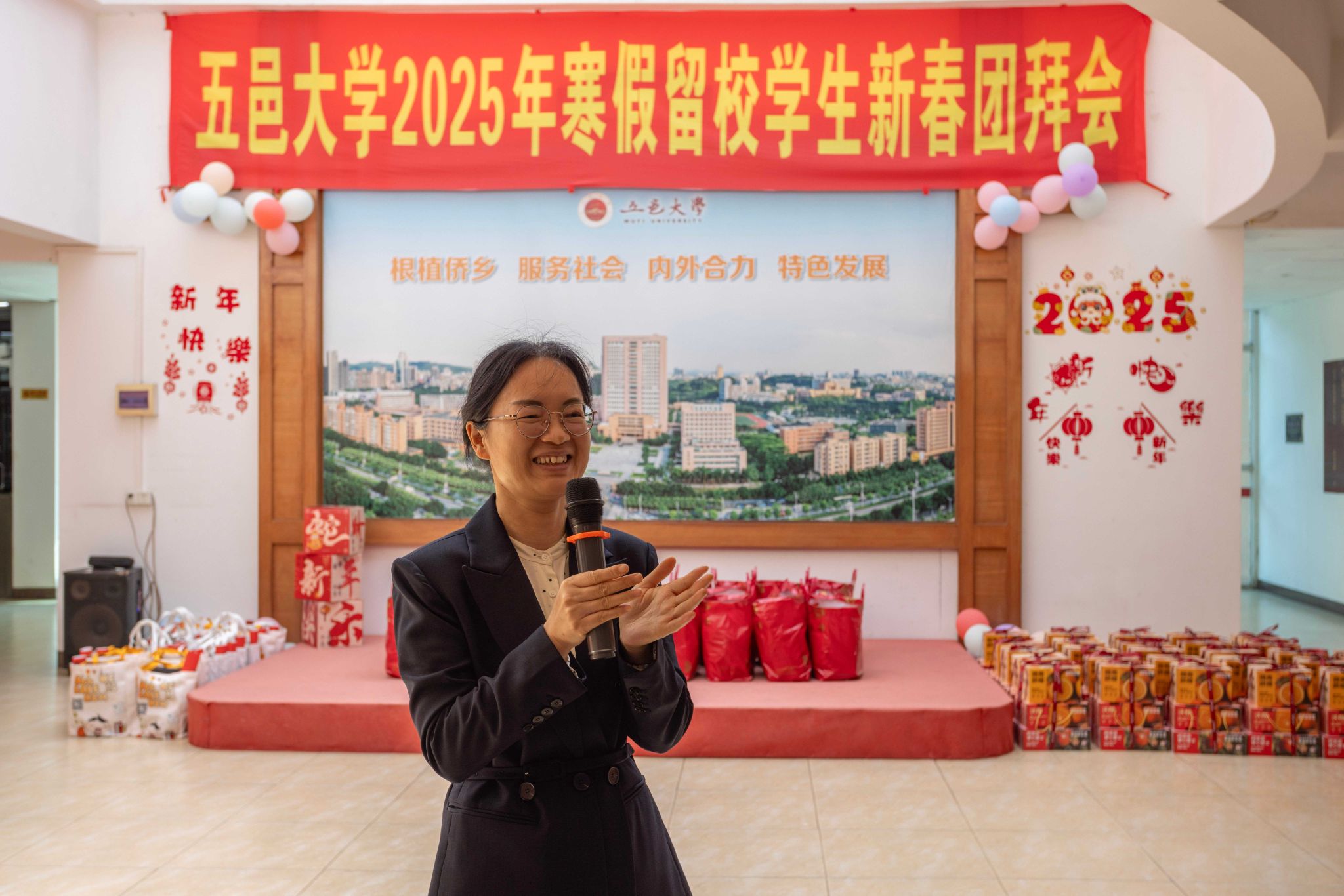 金龍辭歲靈蛇至,新年氣象樂融融。1月25日,學校在文化交流中心舉行2025年寒假留校學生新春團拜會,為留校學生送去關心和祝福。校黨委副書記李華,團江門市委書記李金元、副書記林綺雯,學校有關部門負責人,有關學院黨委書記、副書記及輔導員代表與留校學生齊聚一堂,喜迎新春。