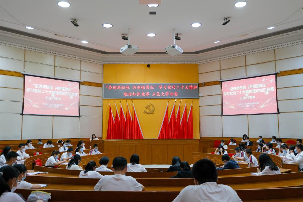 為深入學(xué)習(xí)宣傳貫徹黨的二十大精神,近日由中共廣東省委宣傳部指導(dǎo)、“學(xué)習(xí)強國”廣東學(xué)習(xí)平臺主辦的“奮進新征程 共創(chuàng)強國業(yè)”學(xué)習(xí)黨的二十大精神理論知識競賽正式啟動。除了線上競賽之外,還開展線下團隊競賽。11月17日,由黨委宣傳部主辦、馬克思主義學(xué)院協(xié)辦的“奮進新征程 共創(chuàng)強國業(yè)”學(xué)習(xí)黨的二十大精神理論知識競賽五邑大學(xué)初賽拉開帷幕。