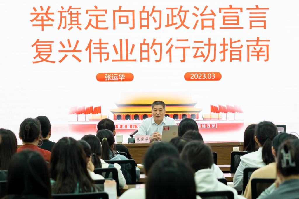 張運華全面介紹了黨的二十大基本概況以及報告的起草、結構和要點,強調黨的二十大報告充分體現了新時代、新征程、新階段的新要求,是黨團結帶領全國各族人民奪取中國特色社會主義新勝利的政治宣言和行動指南,是馬克思主義的綱領性文獻。他深入講解了黨的二十大報告主題,指出新時代新征程中國共產黨的中心任務,既明確了全面建成社會主義現代化強國的奮斗目標,也詮釋了中國式現代化與實現中華民族偉大復興的關系。他強調了在推進中國式現代化、全面建設社會主義現代化國家新征程中實施科教興國戰略的重要性,指出要堅持教育優先發展、科技自立自強、人才引領驅動,堅持為黨育人、為國育才,為加快建設教育強國、科技強國、人才強國貢獻力量。