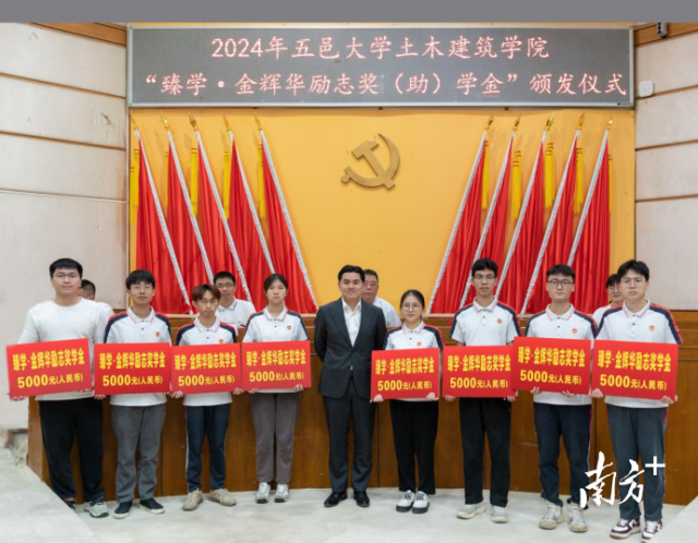 五邑大學土木建筑學院聯合廣東金輝華集團有限公司為12名學生獲頒“臻學·金輝華勵志獎(助)學金”。五邑大學供圖