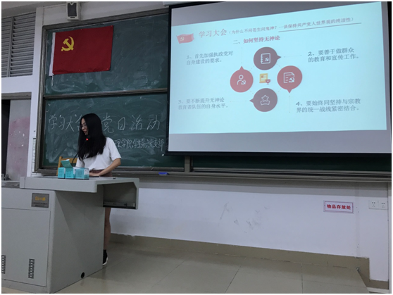 經濟管理學院學生第六黨支部于11月7日21.30在北主樓203召開了關于共產黨員不能信仰宗教的學習大會,支部成員集中學習了《共產黨員不能信仰宗教》和《為什么不問蒼生問鬼神?——談保持共產黨人世界觀的純潔性》兩篇文章,從共產黨員不能信仰宗教的原則立場、為什么堅持無神論以及如何堅持無神論三個方面進行探討學習,緊接著支部成員分享自己的學習心得體會,本次學習大會讓我們明白,作為一名中國共產黨黨員,堅定自己的政治信念,要為共產主義的偉大事業奮斗終生,堅決做到不信教,更不參與宗教活動,并與一切宗教活動做堅決的斗爭。