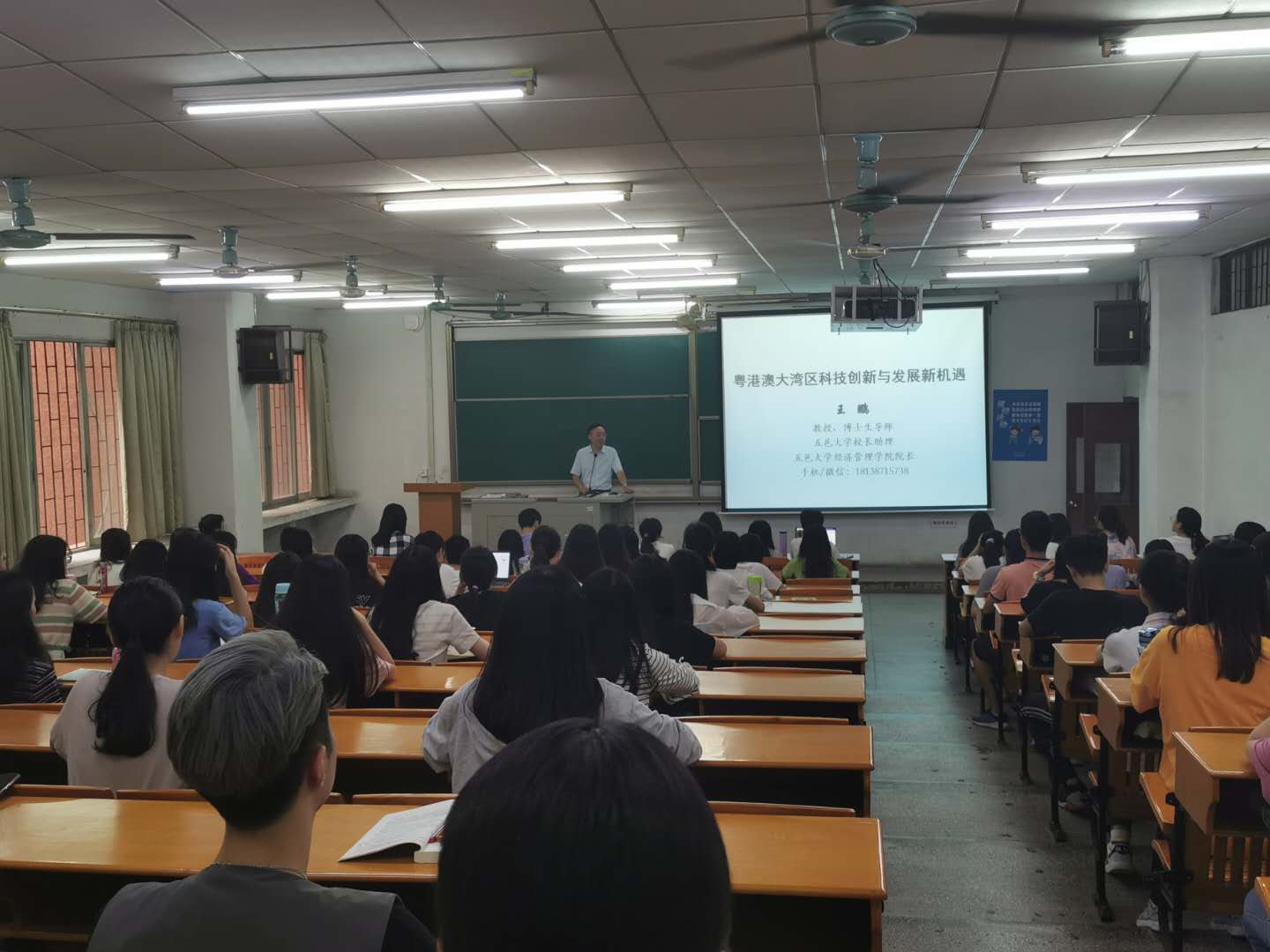 9月28日下午,校長(zhǎng)助理、經(jīng)濟(jì)管理學(xué)院院長(zhǎng)王鵬教授在南主樓213教室講授新學(xué)期第一堂思政課,授課主題是“粵港澳大灣區(qū)科技創(chuàng)新與發(fā)展新機(jī)遇”,經(jīng)濟(jì)管理學(xué)院本科生、研究生代表共100余人參加本次學(xué)習(xí)。