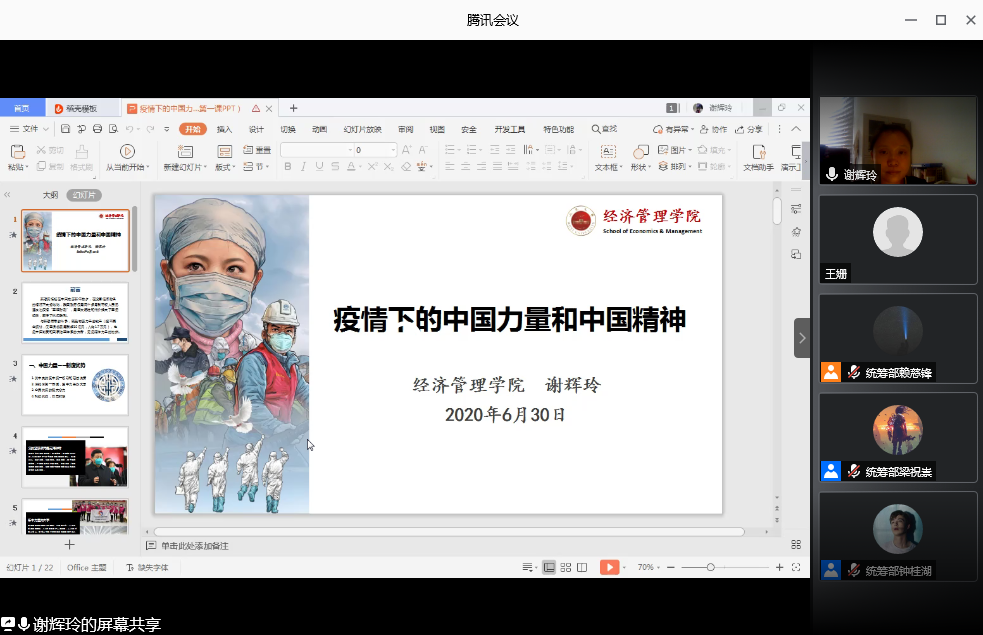 課上,謝輝玲書記通過視頻與圖片分享、案例解析等多種形式,通過講述黨中央的集中統一領導和高效決策,堅持全國一盤棋、集中力量辦大事,全國人民的顧全大局和積極防疫,以及科技抗疫取得的巨大成就,來詳細為學生們分析了中國力量之制度優勢;通過詳細解讀《中國抗疫圖鑒》以及“致敬醫者、致敬勇者”視頻,來分析眾志成城、自強不息、以人為本的中國精神;最后謝輝玲書記還講述了疫情下的中國青年奮勇擔當的各種突出表現,為在座黨員同學樹立榜樣標桿,并以《習近平總書記給北京大學援鄂醫療隊全體“90后”黨員的回信》結束本場講課,號召廣大黨員學生堅定理想信念,站穩人民立場,練就過硬本領,投身強國偉業!(文/圖 經濟管理學院)