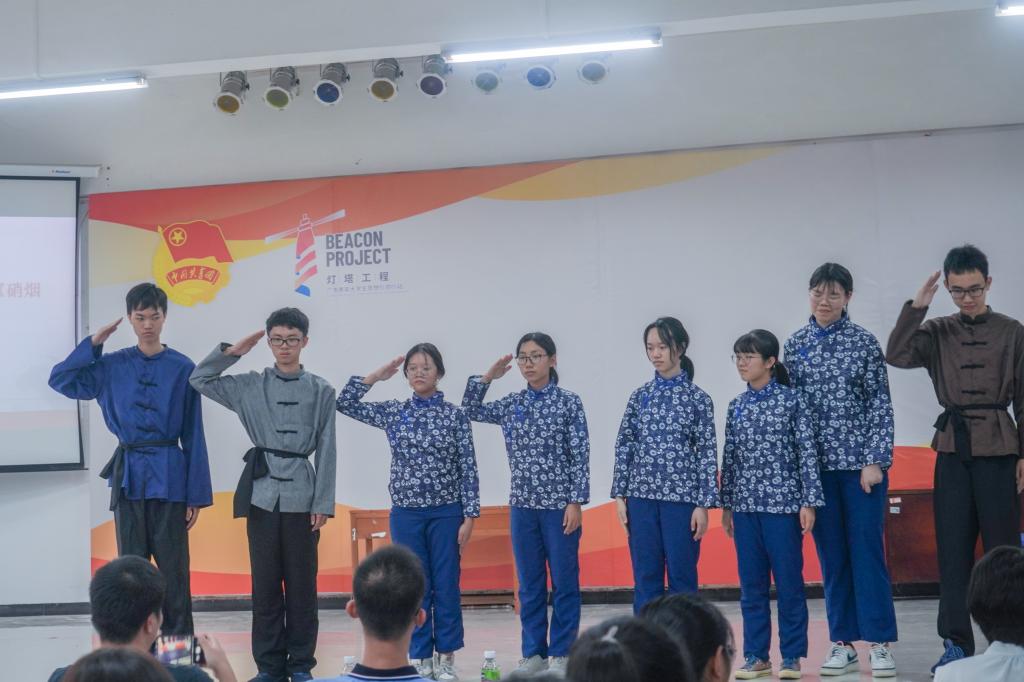 隨后,兩個班級展示了自編自演的話劇《周總理在新會》和《鏗鏘中的硝煙玫瑰》。同學們通過查找史料、學習僑鄉革命歷史故事,用心演繹紅色經典,展現了周總理心系群眾,艱苦樸素的崇高風尚,以及革命先輩阮瑞瓊堅貞愛國的抗日精神。同學們認真投入,場景重現逼真,這堂以僑鄉紅色文化為背景的理想信念教育課,讓青年學子們在喜聞樂見的話劇中增強對僑鄉文化的認同感,筑牢了信仰之基。