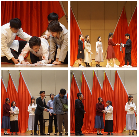 隨后,江門職業(yè)技術學院雅文話劇社帶來了自編自導的紅色話劇《大義長爭》和《賣子救國》。通過觀看精彩話劇演出,同學們對五邑地區(qū)好黨員李少石革命烈士的故事有了更深刻的認識和體會;江門籍華僑鄭潮炯賣子救國的故事深深打動了在場的同學們,大家更深層次地理解了“在國家利益面前,沒有國,哪來的家!”的真正含義。這兩個本土紅色故事讓同學們深刻地感受到僑鄉(xiāng)紅色精神的力量,進一步地堅定了青年大學生理想信念。