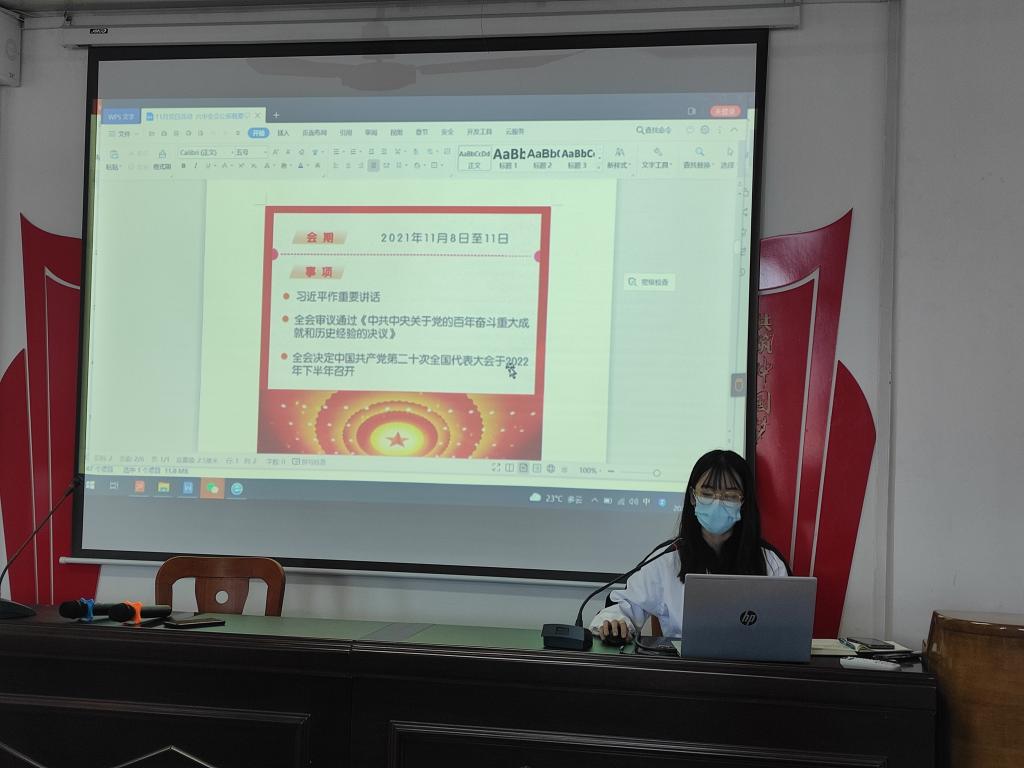 吳老師總結指出,六中全會全面總結黨的百年奮斗的重大成就和歷史經驗問題,并號召全體黨員要發揚艱苦奮斗精神,再創輝煌。身為青年大學生的我們,是“兩個一百年”和中華民族偉大復興的參與者、貢獻者、見證者,更是黨的隊伍發展壯大和永葆生機的活力之源。我們肩負著歷史和國家的重擔,不但要用六中全會精神武裝頭腦,更要用來指導實際工作,開啟新征程。接下來,我們用行動來踐行全會精神。