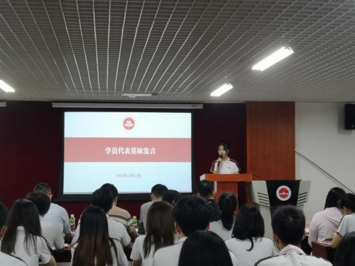 會上,輔導員張曉琳從班級組建、培訓目標、培訓內容、培訓形式和具體安排五個方面介紹“踔厲先鋒”班的基本情況。學員代表莫妹圍繞黨的二十大報告講述了個人學習及生活的親身感受。