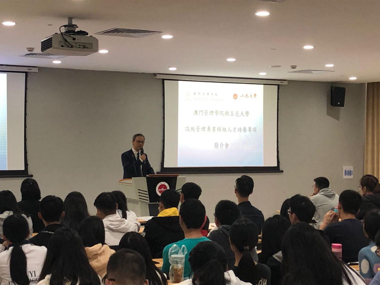 會上,陳光教授介紹了行業(yè)發(fā)展和國內(nèi)設(shè)施管理學(xué)科的創(chuàng)建歷程,講解了設(shè)施管理服務(wù)在中國的表現(xiàn)和巨大市場需求,讓學(xué)生明晰了設(shè)施管理的涵義和這個國內(nèi)新興行業(yè)的發(fā)展前景。楊勤女士結(jié)合自身在華為、高盛等企業(yè)設(shè)施管理部門的工作經(jīng)歷,向?qū)W生介紹了設(shè)施管理的國際職業(yè)資格認(rèn)證及就業(yè)情況,并表示IFMA深圳分會愿向?qū)W生提供實踐教學(xué)和就業(yè)支持。澳門管理學(xué)院院長鄭慶云博士介紹了兩校合作背景和該項目的重要意義,詳細(xì)講解了設(shè)施管理專業(yè)模塊的培養(yǎng)目標(biāo)、課程體系、教學(xué)計劃及教學(xué)管理,展示了澳門管理學(xué)院實踐教學(xué)課程的授課方式和特色。參會學(xué)生興趣濃厚、反響熱烈,圍繞培養(yǎng)方案、教學(xué)安排、實踐課程、職業(yè)認(rèn)證、就業(yè)前景等方面與宣講嘉賓進(jìn)行了長時間的互動交流。
