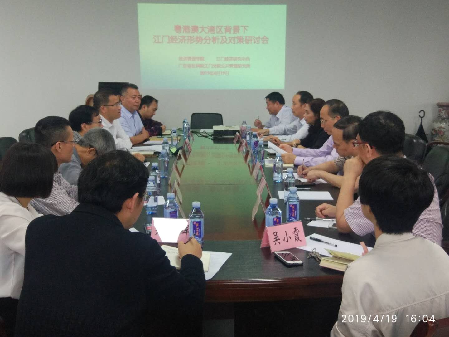 4月19日下午,五邑大學經濟管理學院、江門經濟研究中心(以下簡稱中心)、廣東省社科院江門分院公共管理研究所聯合召開粵港澳大灣區背景下江門經濟形勢分析及對策研討會。江門市委政研室主任鄭文江,江門市社科聯主席譚樂生,五邑大學人事處劉志堅教授,經濟管理學院院長肖健華教授,經濟管理學院黨總支副書記謝輝玲,江門經濟研究中心主任王潤良教授,江門市統計局總統計師趙前斌,江門職業技術學院副校長蔡勇,江門市第一職中黨總支書記何周林,江門市社科界老領導余國欽、李超奇以及中心研究員等二十多人出席會議。會議由中心主任王潤良教授主持。