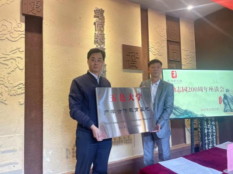 儀式上,五邑大學經濟管理學院副院長李響與恩平市歇馬舉人村旅游區有限公司總經理周澤強共同為“五邑大學產學合作教育基地”揭牌。