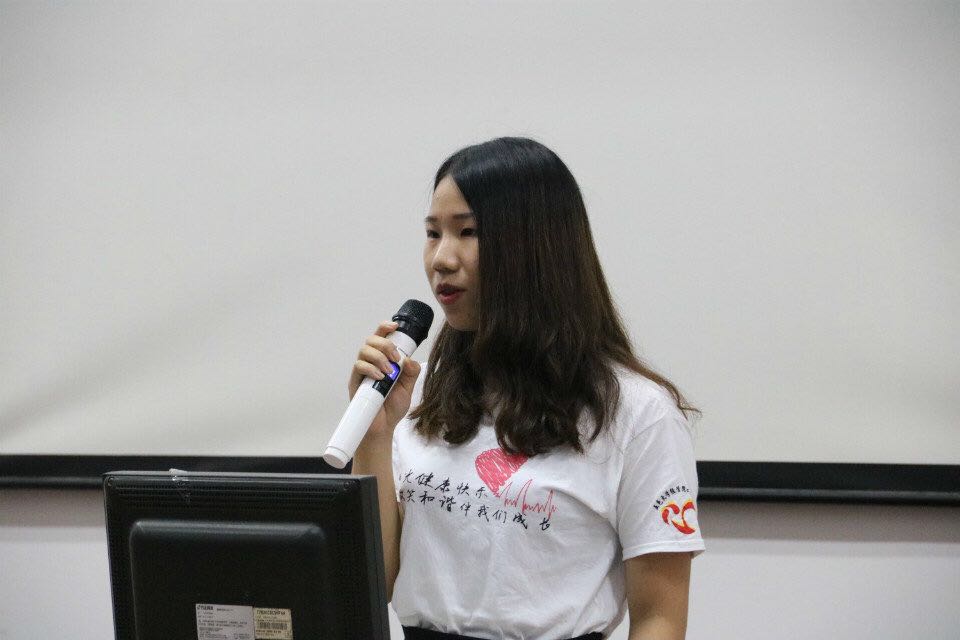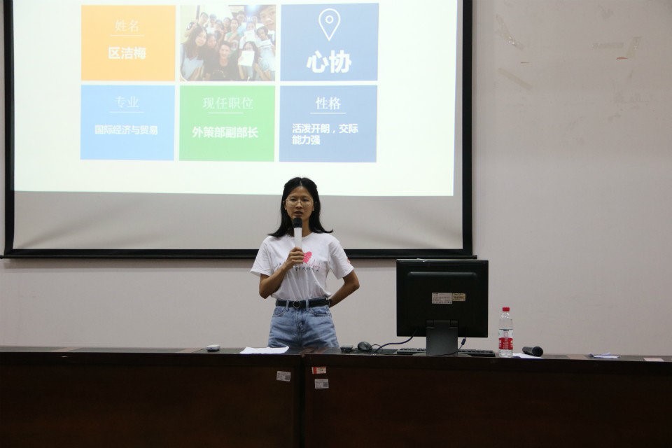 接下來是來自培訓部的新任主席梁舒婷上臺進行演講。演講初始,她給我們講述了這一年以來培訓部的工作總結,工作內容主要是策劃組織開展團輔、內部活動和擺攤。她在大會上提出:施政綱領要符合實際,具體細化落實。其中,第一點是豐富活動,加強凝聚力;第二點是干事要經過基礎培訓,加強對心協的了解;第三點是明確活動的工作流程;第四點是建立獎懲制度;第五點是加強與輔導員的溝通。