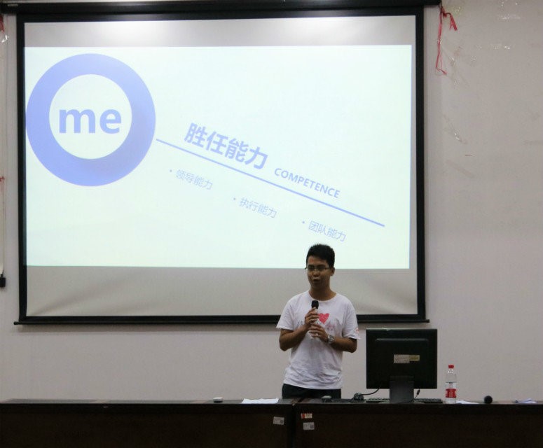 會議的第一環節:新任主席團演講(自我介紹、施政綱領、答辯)。第一位新任主席是來自培訓部的古智聰,他從責任與義務、勝任能力和目標規劃這三方面展開論述。他認為:作為一名領導者,領導、統籌、溝通和協調能力是非常重要的,他會著力加強自身的執行力和加強團隊的能力。并通過交流加強各部門之間的聯系從而達到精準策劃的目標。