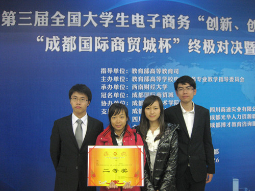 第三屆全國大學生電子商務“創新、創意及創業”挑戰賽“成都國際商貿城杯”總決賽于2011年11月26日在西南財經大學舉行,來自全國28個省分賽區的256支精英團隊進行了角逐。我院肖健華副院長帶隊參賽,由謝燕如、任曉敏、林健源、劉智安四位同學組成的“綠寶寶”團隊榮獲全國二等獎。同時,葉藝勇老師榮獲“優秀工作者”稱號。