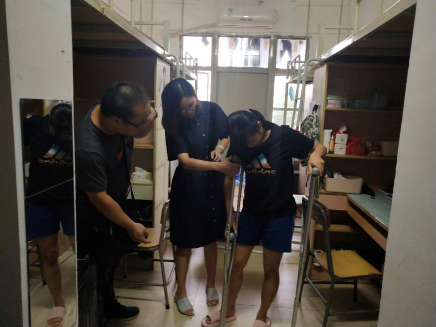 班導(dǎo)師葉藝勇為左腳歪傷新生買來拐杖
